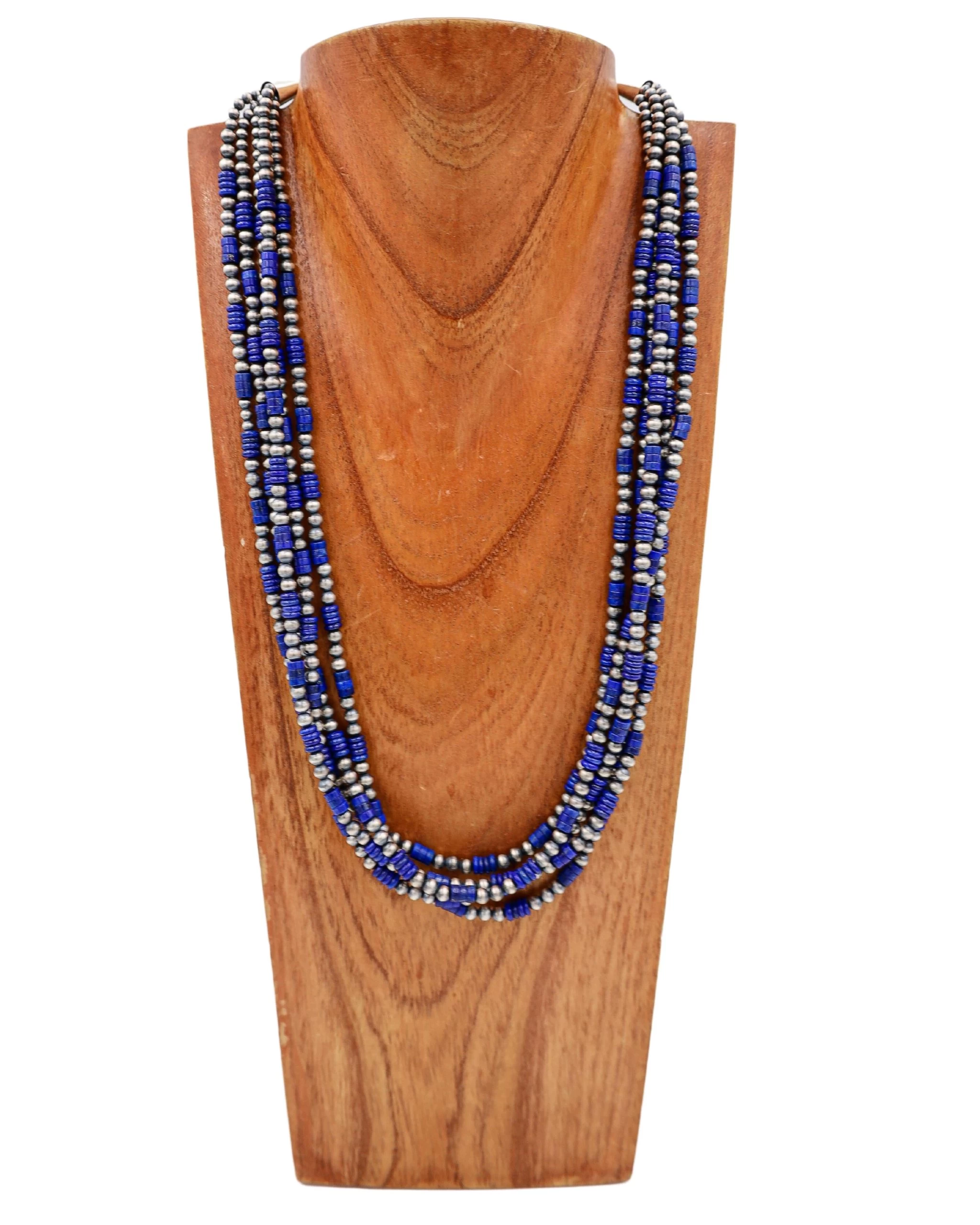 This stunning necklace exudes luxury! Crafted from five strands of sterling silver and an array of luxurious beads; each carefully selected for size, shape and color for an exquisite combination. Enjoy the glamour of lapis and Navajo pearls, perfect for any special occasion or everyday use. What sparkle will you add to your wardrobe?