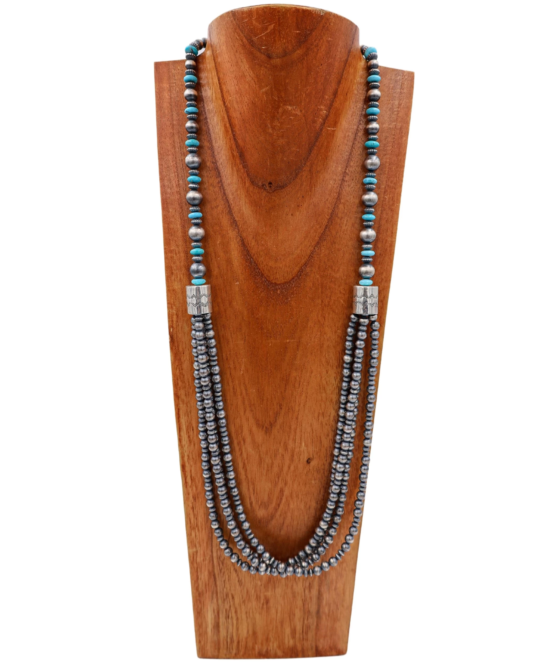 Stunning turquoise and sterling silver seamless Navajo Pearl 4 strand necklace. This beauty is the ultimate “Southwestern” accessory in your jewelry box. A variety of sizes of Navajo Pearl beads are paired with bright blue turquoise in this substantial and visually interesting necklace. Finished with chain extender and hook closure. Wear it alone, layered or with your favorite pendants…it will always look great.