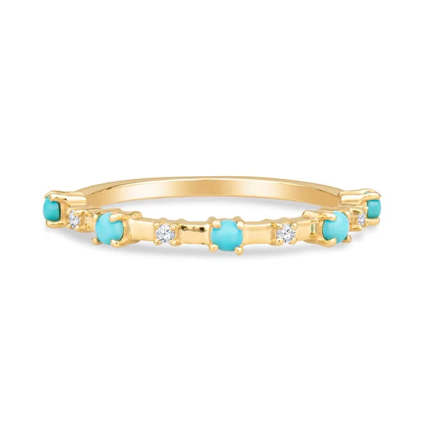Add a sophisticated touch to your look with this turquoise and diamond ring. The Alyssa ring features four diamonds alternated by five polished turquoise stones. The round stones and diamonds are beautifully set into this 14K gold band. A stylish touch for special occasions and everyday wear alike, this beautiful turquoise ring is a unique addition to all of your favorite looks. This gold diamond ring also makes a beautiful gift for those who love precious and semi-precious stones.