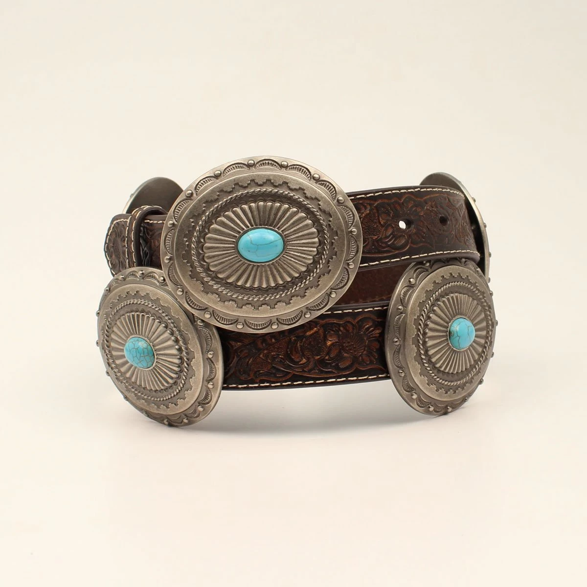 Description This ladies Ariat belt by M&F Western Products has a stylish western look. The strap has a floral embossed pattern and oval silver conchos that are each accented with a turquoise stone. This belt is perfect for a night on the town.