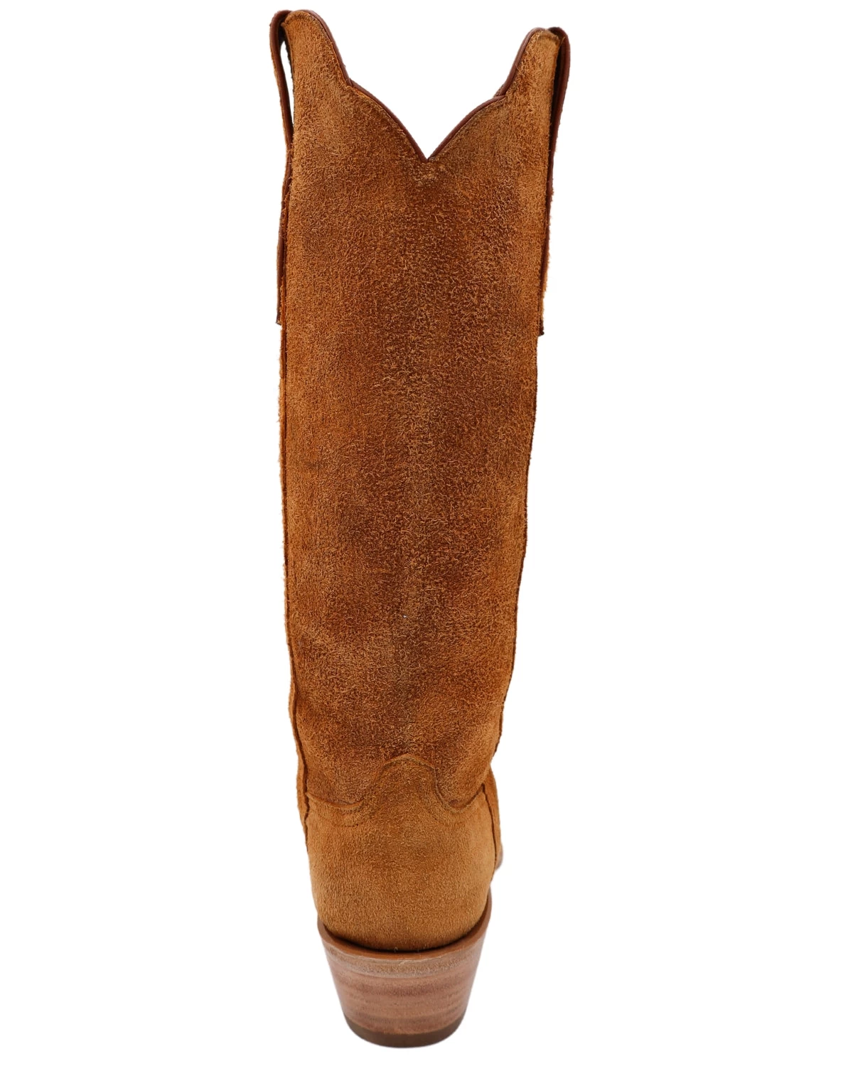 This cowboy boot is a staple piece with its simple and elevated design. The leather is colored in a fun shade of cognac. The tumble effect gives the roughout boots a darker hue in some spots. Each of the Black Jack Boots are proudly crafted by hand, so each piece is unique.
