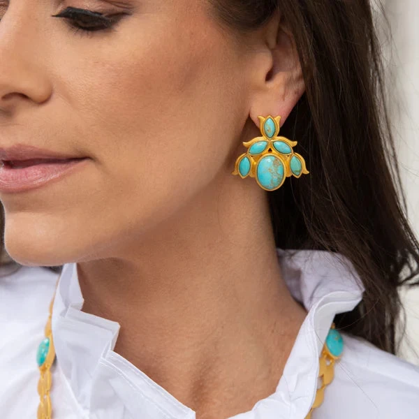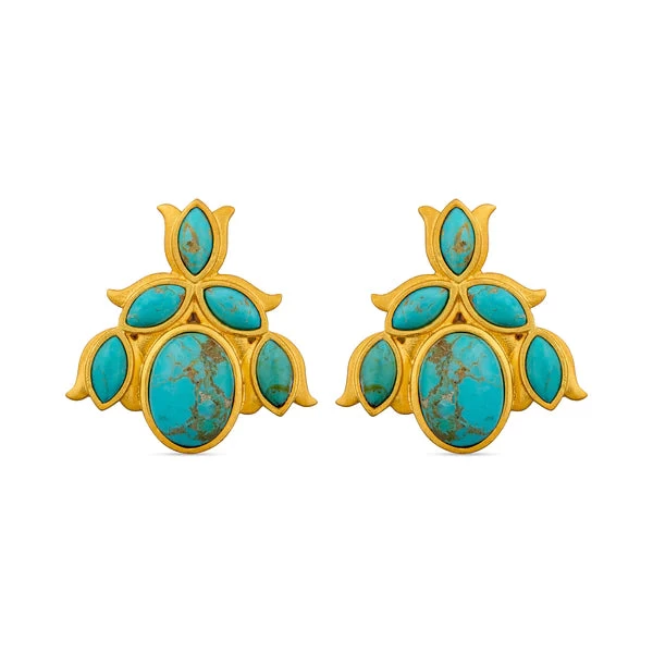 Take a moment to appreciate the flowers with the Bluebell Stud Earrings in Turquoise. These beautiful earrings feature hypoallergenic 18K gold-plated brass and turquoise stones, and are shaped like delicate bluebell flowers. With their post back closure, these earrings are a comfortable and secure fit for any wearer. Complete the look by pairing these turquoise earrings with the Verona Tulip Necklace or the Orchid Necklace. These earrings are also available in green strawberry quartz.