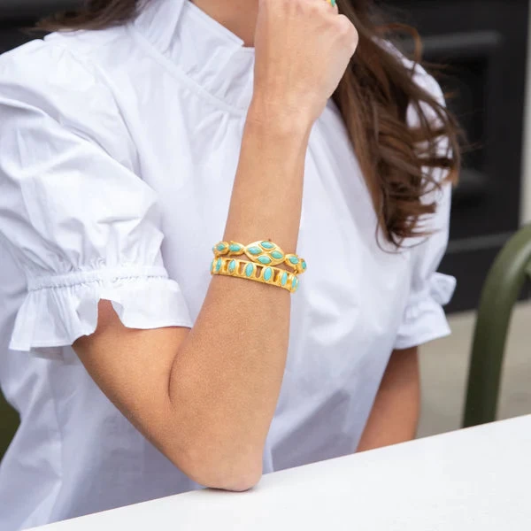 Adorn your look with something extra special when you add the Primrose Cuff to your stack. Featuring a row of gorgeous petal-shaped turquoise stones and four petals accenting the centerpiece, this bracelet is a perfect stacking piece. This cuff is crafted from hypoallergenic 18K gold-plated brass, making it comfortable for those with sensitive skin. It features an open back and is adjustable to fit most wrist sizes. This exquisite bracelet will make a stunning addition to any jewelry collection. Pair this turquoise bracelet with the Primrose Stud Earrings and Primrose Necklace for a complete look. This cuff is also available in green strawberry quartz.