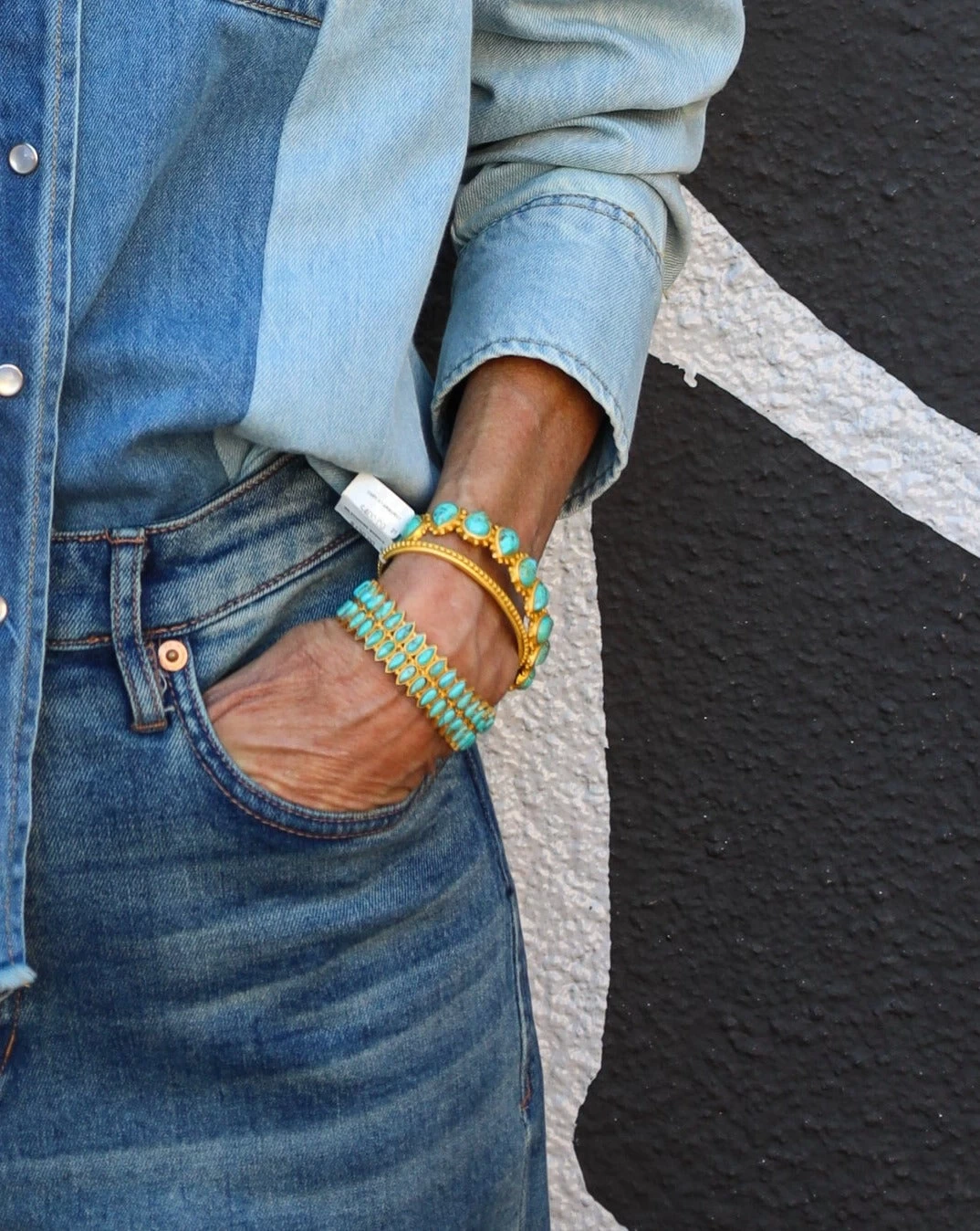 Add to your favorite bracelet stacks or make a simple statement with the Starburst Cuff. This bracelet features alternating teardrop-shaped turquoise stones set into our signature 18K gold plated brass. Studded details adorn the cuff throughout and add beautiful texture. An open back provides a one-size-fits-all design that allows the wearer to choose their perfect fit. Style this hypoallergenic cuff with the matching Starburst Stud Earrings or the North Star Ring for a complete look for day or night.