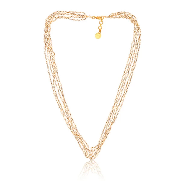 Glamour day or night starts with the Stay Golden Collar Necklace. This 18K gold-plated brass necklace features 5 chains adorned by gorgeous pearl beads. Effortlessly style this pearl necklace for daytime with a simple t-shirt or dress, or amp up the drama by pairing it with your favorite strapless or square neck gown for a formal occasion like a wedding or gala.