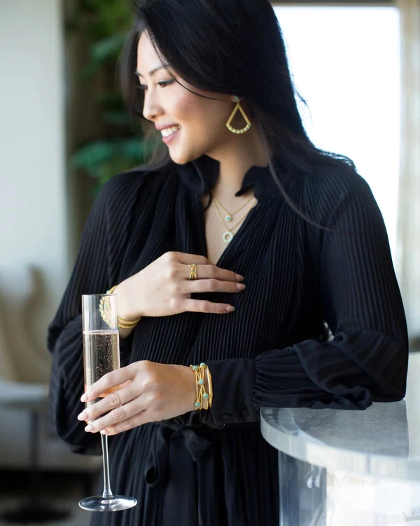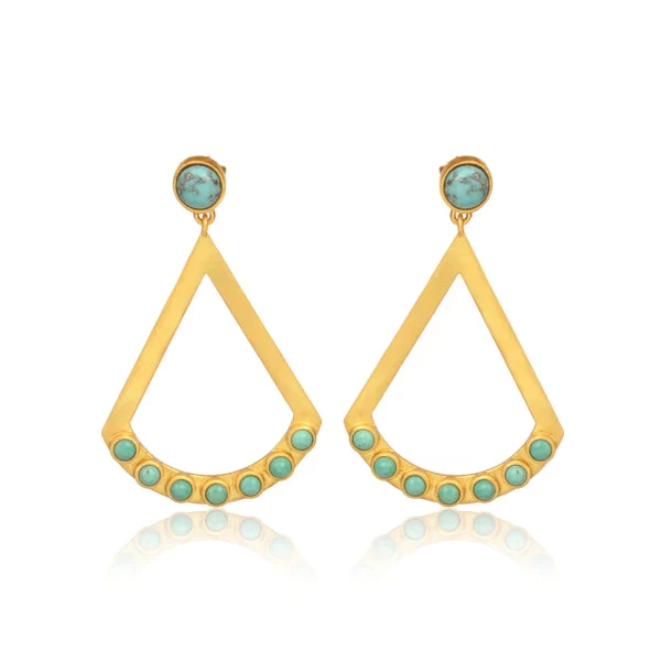 Center your jewelry collection with these turquoise statement earrings. The teardrop earring is grounded by a medium turquoise stone in a bezel setting with a comfortable post backing. A sweeping, teardrop shaped chandelier hangs from the center stone and is accented by seven small turquoise stones in bezel settings. This chandelier earring has a hammered texture as it is crafted from brass and plated in 18K gold. Channel the serenity with these turquoise stone earrings when you wear them out.