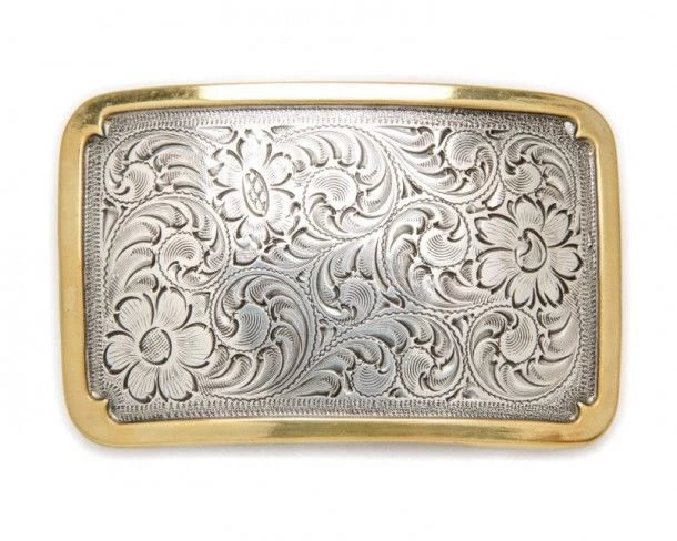 - You can wear a nice silver metal rectangular belt buckle with engraved floral filigrees and a golden edge that will perfectly match with all belts.