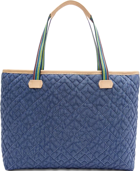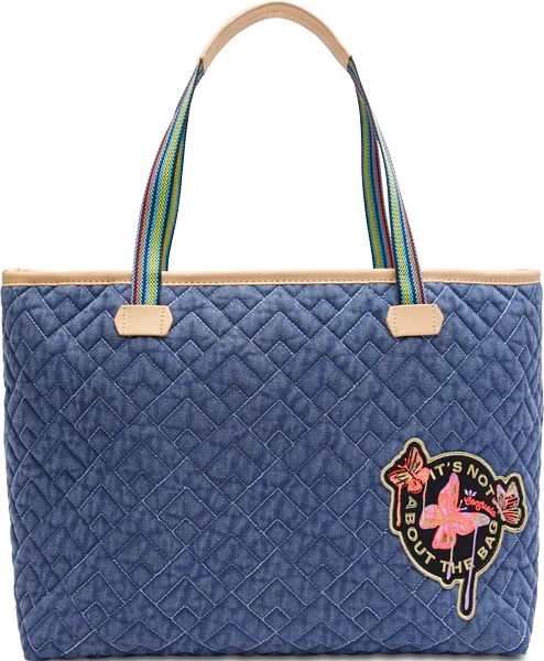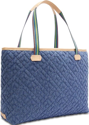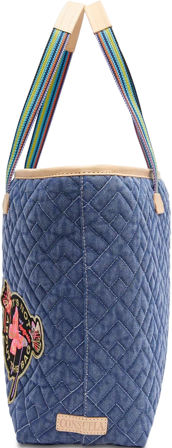 - Quilted blue denim exterior with embroidered patch