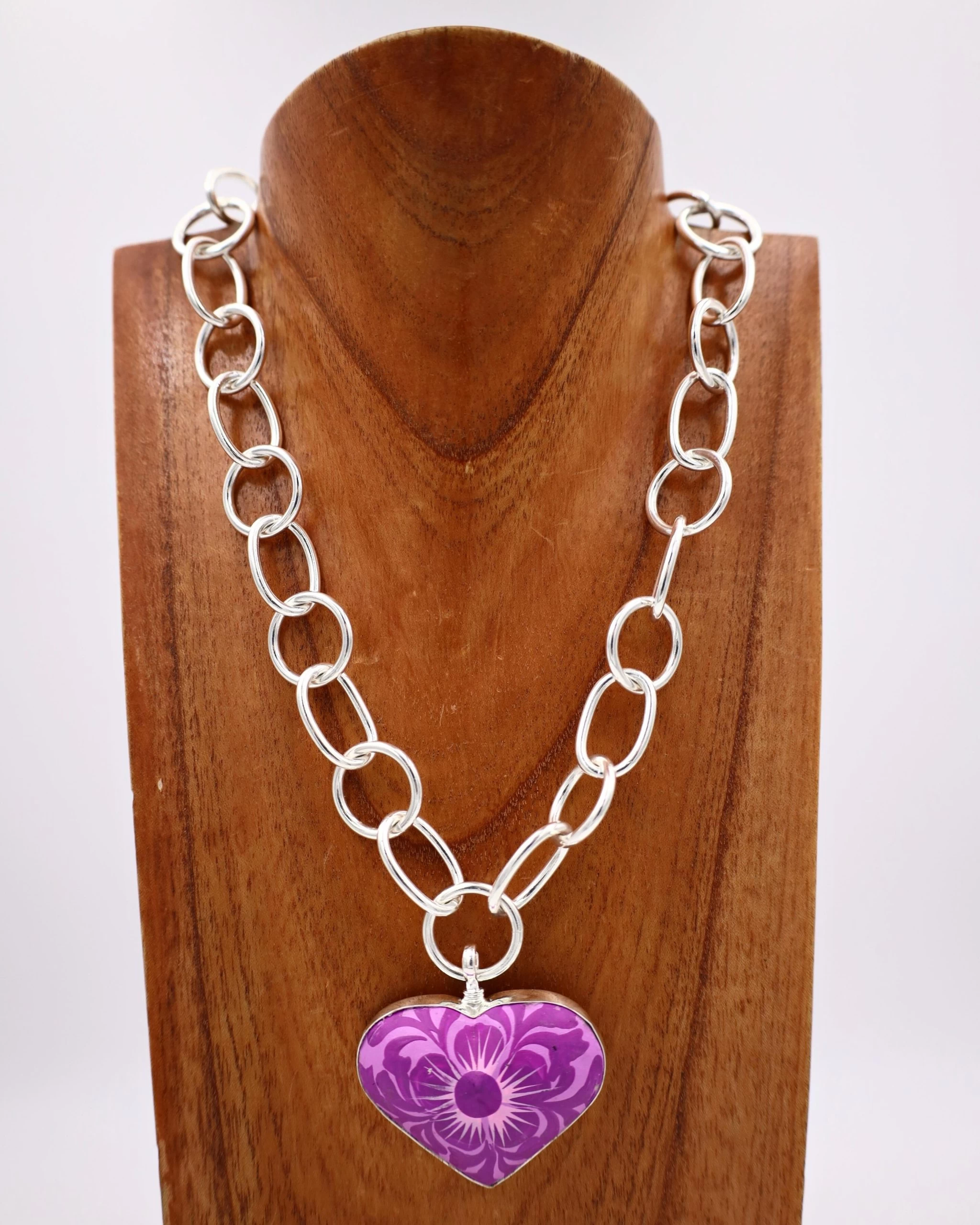 Tell your story with Coreen Cordova’s Lavender Heart With Purple Flower Pendant. With intricate purple floral design over a crisp, lavender background on a 3D heart, this charm can be worn solo or on a chunky chain along with your other favorite pendants.