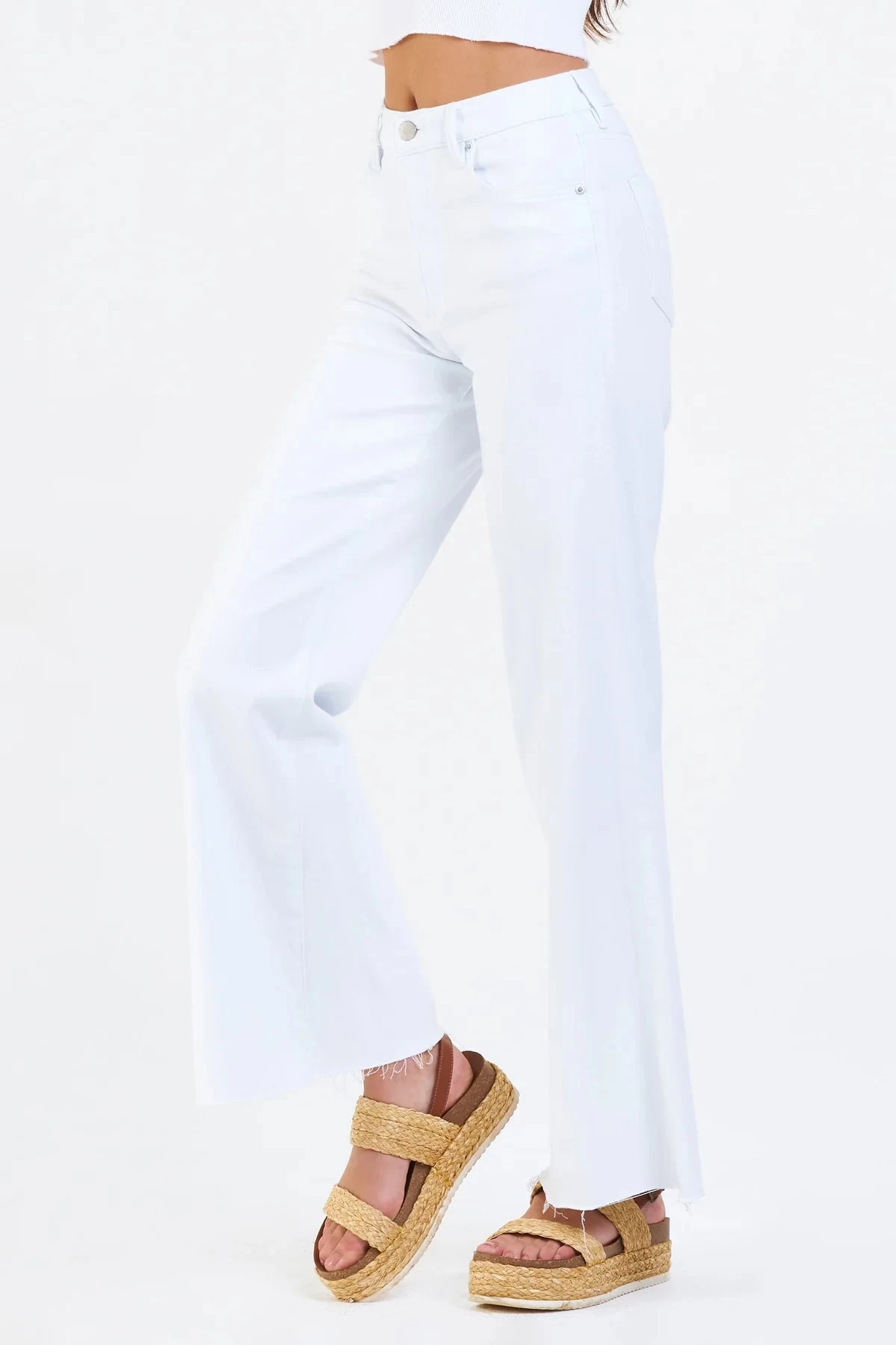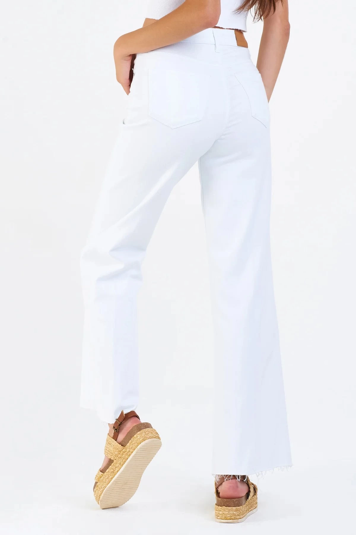 Super high rise wide leg jeans. It’s the trusted fit that sits at natural waist and easy fitting in the hips and thigh. Full inseam on stretch denim accented with cut-off hem details, washed and brushed for softness in designer color palettes, tailored center inseam press.