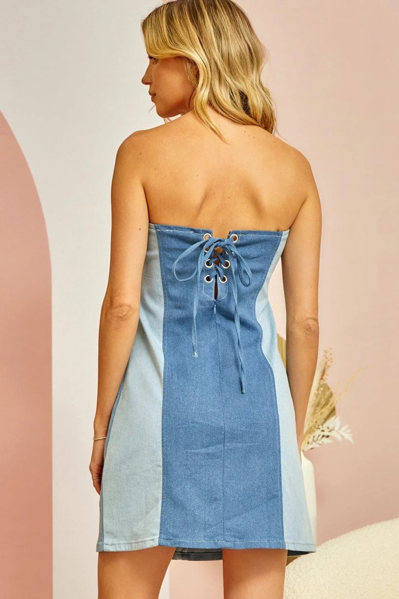 Easy tencel tube dress with different shades of denim color. We love the tie back detail on this mini dress! Fun, semi stretchy.