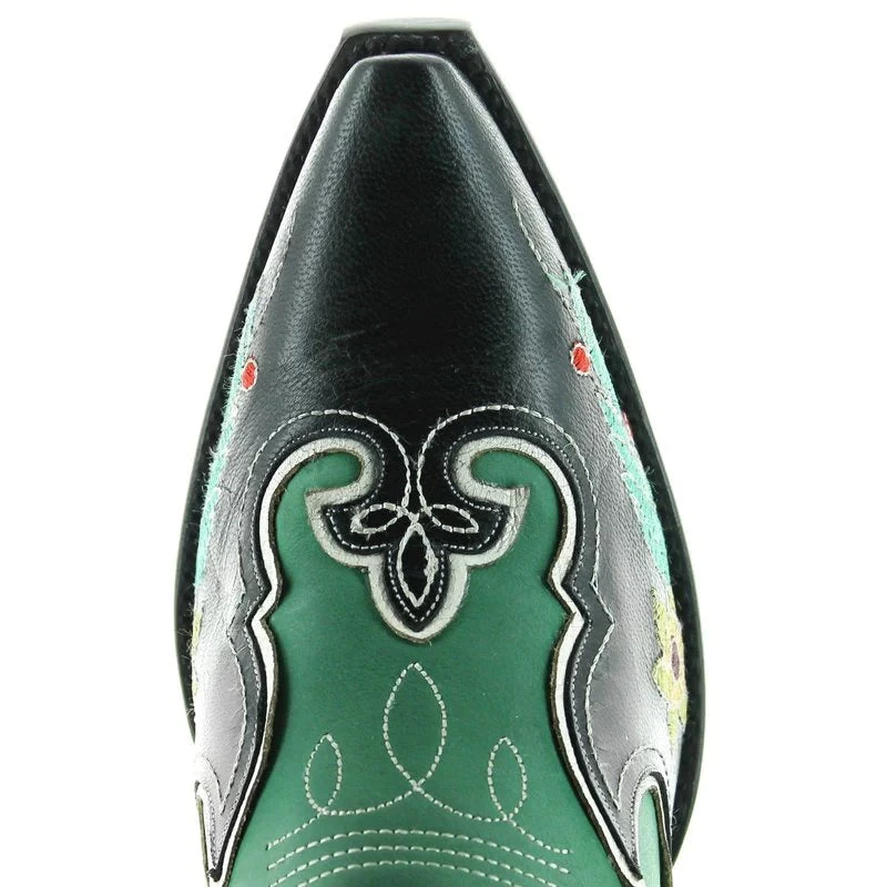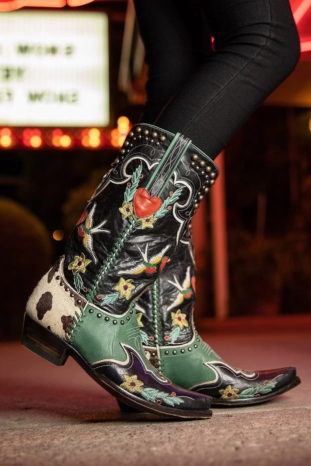 This boot gives us all the retro vibes! Let this Midnight Cowboy whisk you away. This boot has a stunning blend of retro colors, intricate embroidery, inlay and overlay leather details, contrast whip stitch, gun powder studs, and a sassy pony hair heel counter.