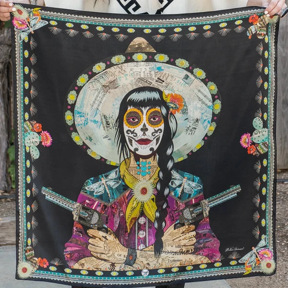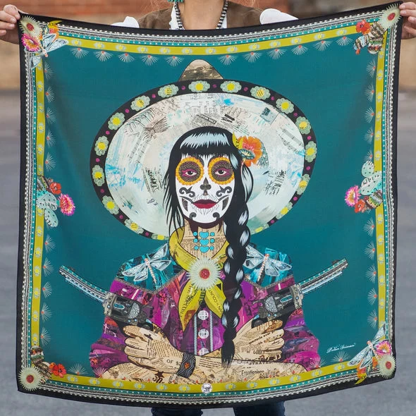 We are so excited to have nationally recognized mixed media artist, Dolan Geiman, showcasing five of his amazing designs in this year’s Fringe collection. The Dragonfly Daredevil is one of five original works from Dolan in this year’s lineup.  All the pieces in this scarf tell a story, have fun zooming in and finding treasures throughout this beautiful silk scarf.