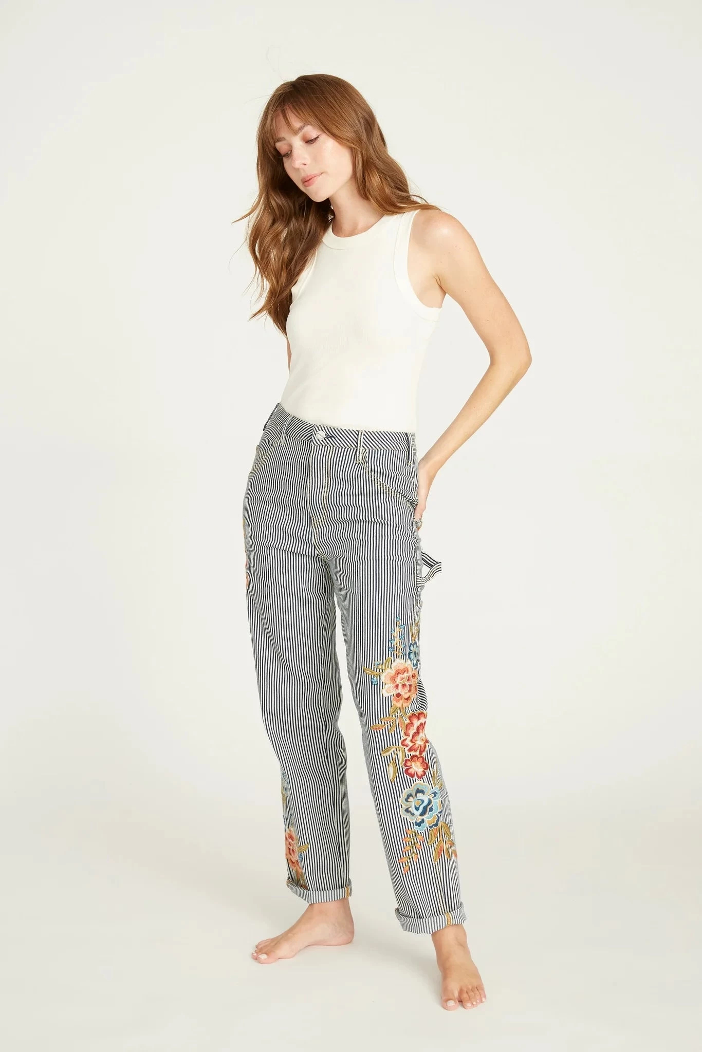 Cool with a utility-inspired touch. These pinstripe carpenter pants keep a workwear feel while adding a floral femme touch, giving you endless ways to style.