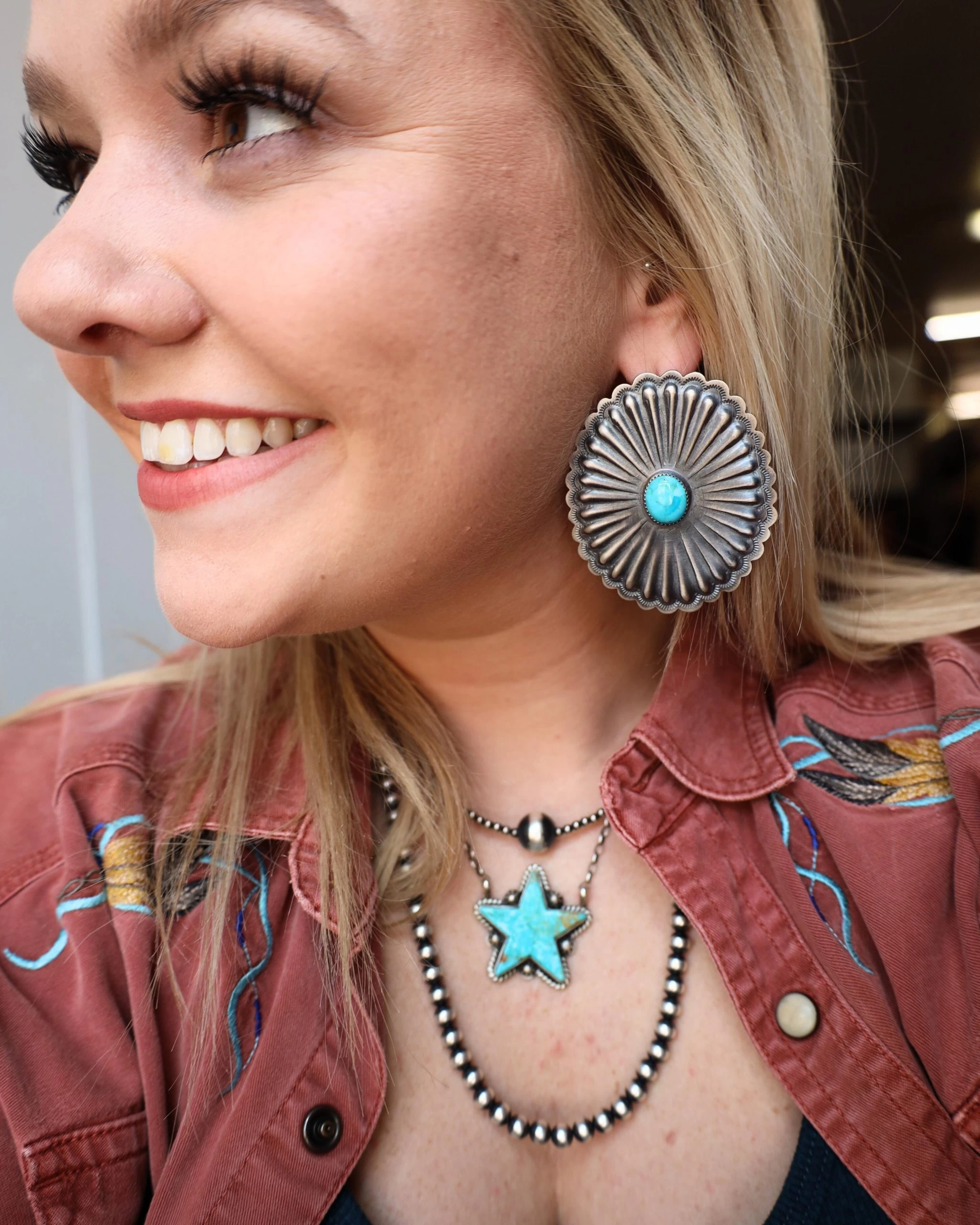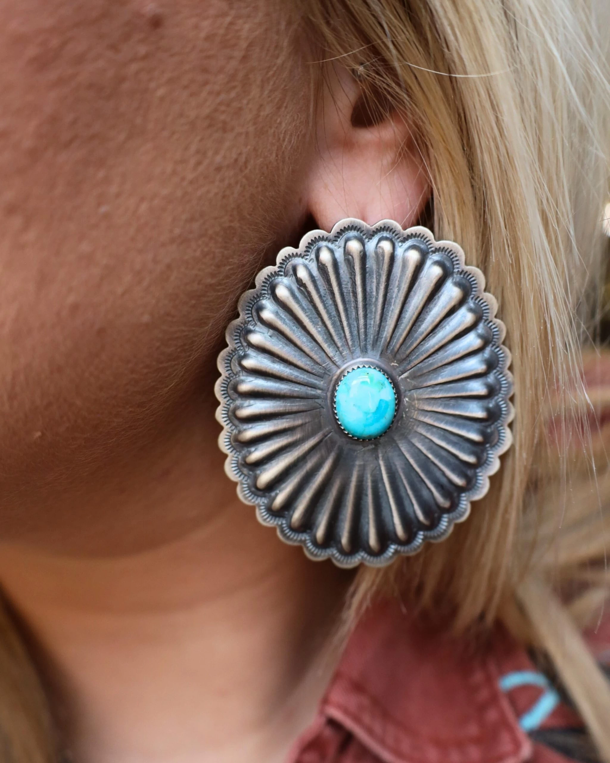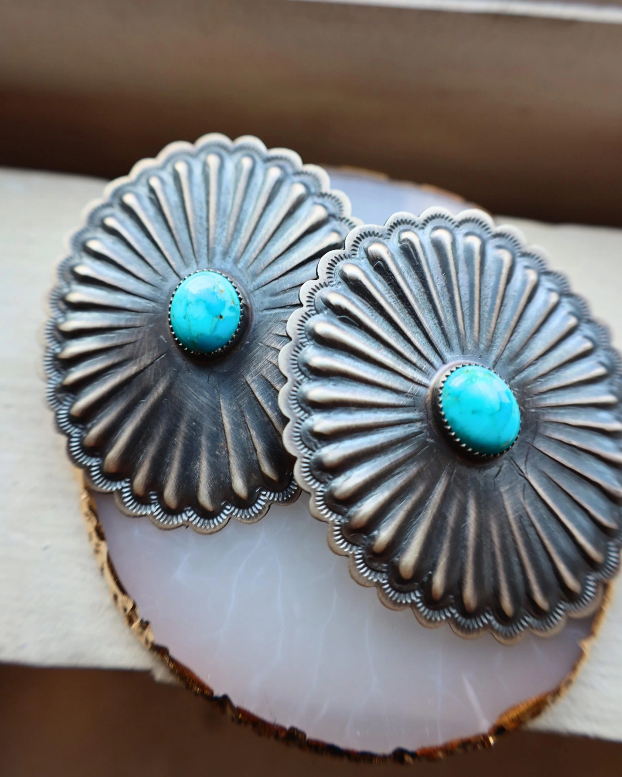 Old vintage style sterling silver turquoise concho earrings handmade from Al Zuni Of Gallop. These elegant earrings feature traditional oval concho design, with a natural light blue turquoise stone serrated bezel set in center. The artist also cut the edge into sweet scallop shape and stamped with nice details. The surface is brushed and oxidized to create antiqued old style finish. These beautiful earrings are sure to add charm to your outfit!