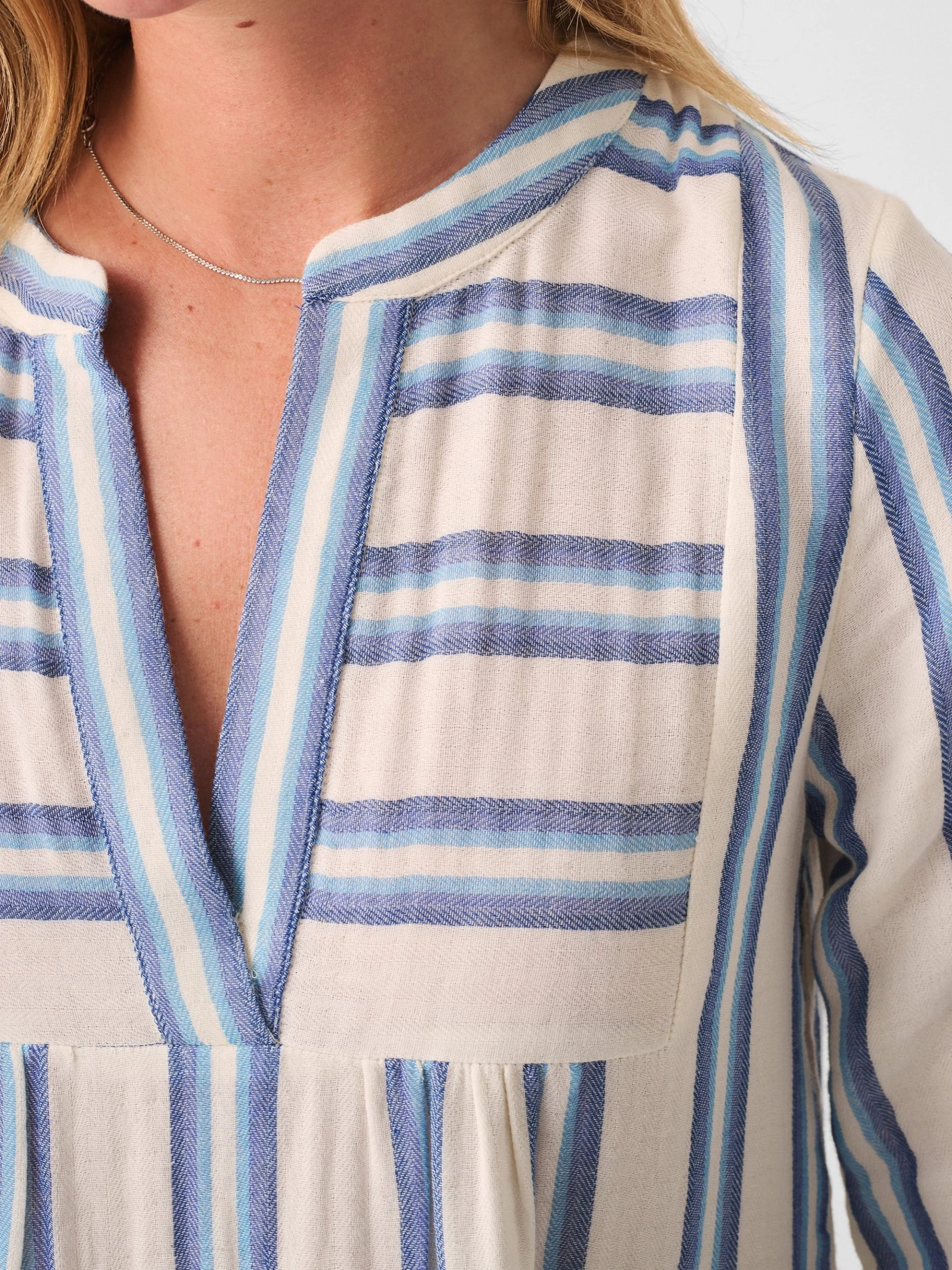 For a look that’s casually chic, the midi version of our fan-favorite Vida dress grazes below the knee with a relaxed and romantic tiered skirt. With textured yarn dye stripes and whimsical bell sleeves, it captures a sun-kissed boho spirit that makes it a perfect choice for everything from backyard barbecues to music festivals.