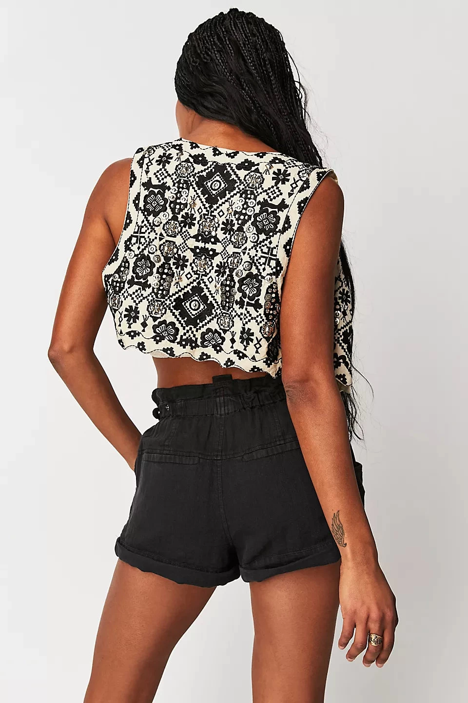 Add the loveliest layer to any look with this vintage-inspired vest featured in a cropped, open-front silhouette with stunning embellishments throughout and scalloped hems for an added special touch.