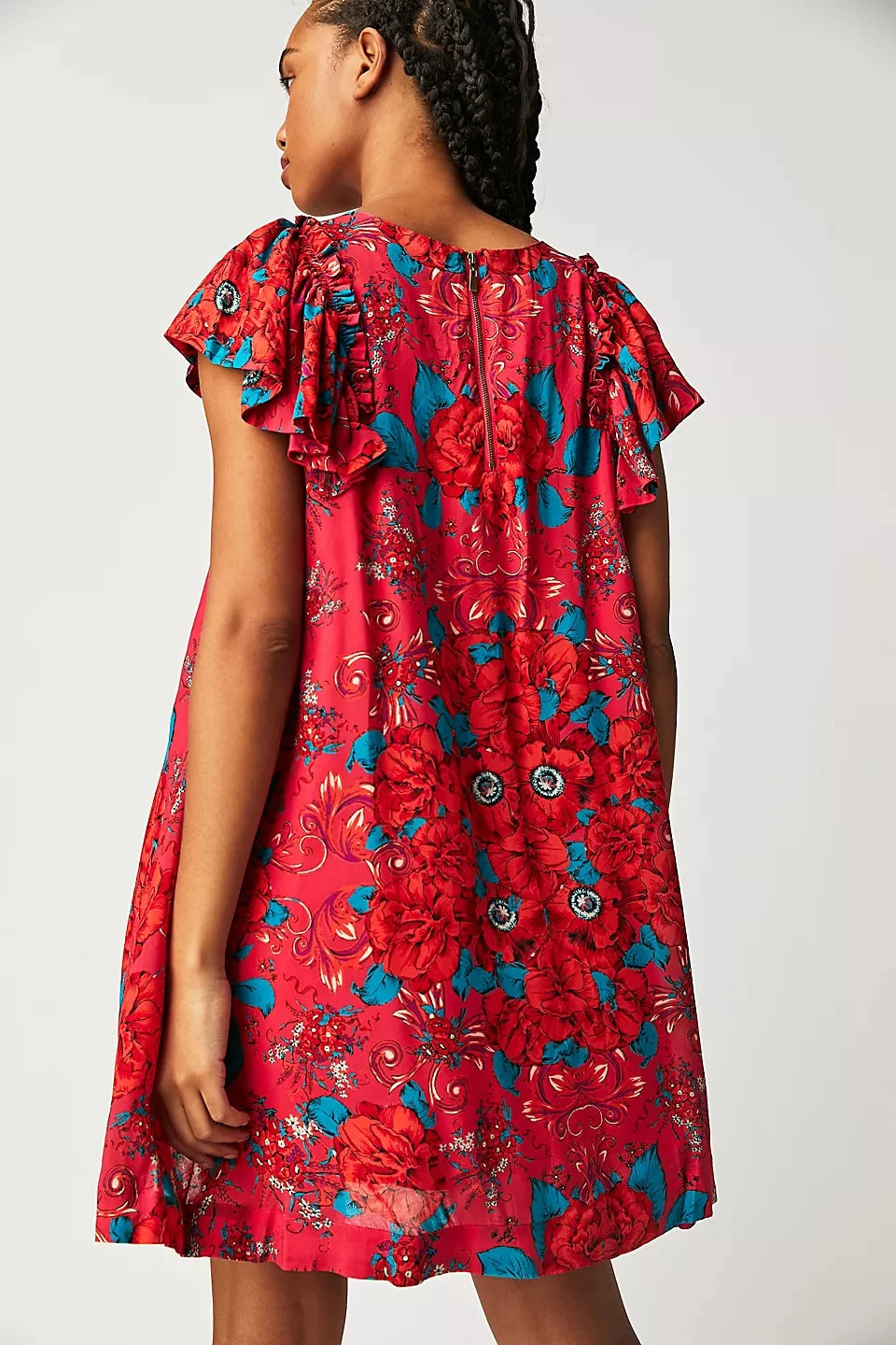 So fun and femme in a classic floral print, this effortlessly essential mini dress is featured in a relaxed, shapeless fit with ruffled flutter sleeves for added dimension.