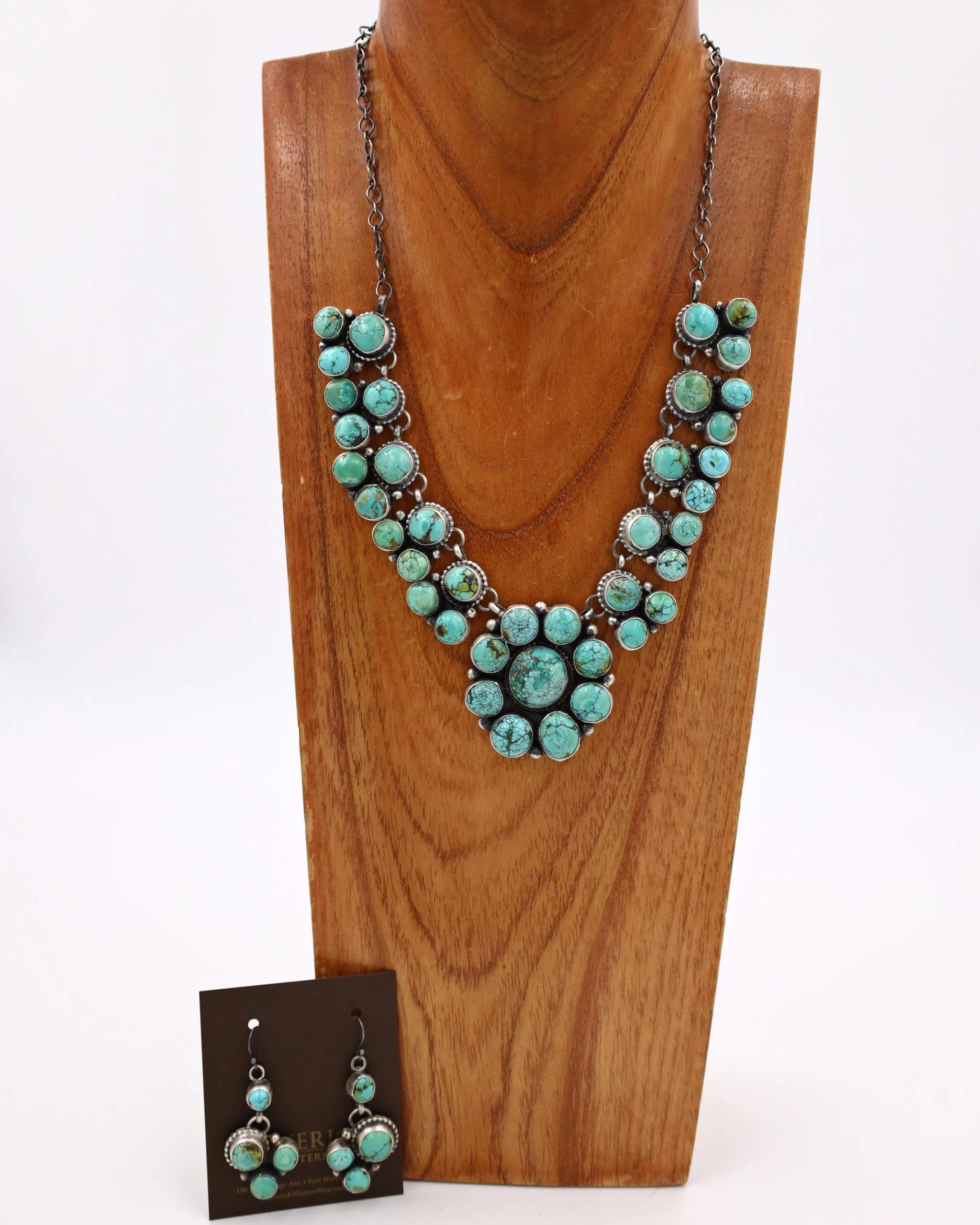Adorn yourself with this gorgeous Green Turquoise Rounds Necklace and Earring Set! This exquisite set features 39 stones in the necklace and 8 stones in the earrings, all encased in a delicate sterling silver bezel. Dare to make a statement with this unique necklace and earring set—each as one of a kind as you!