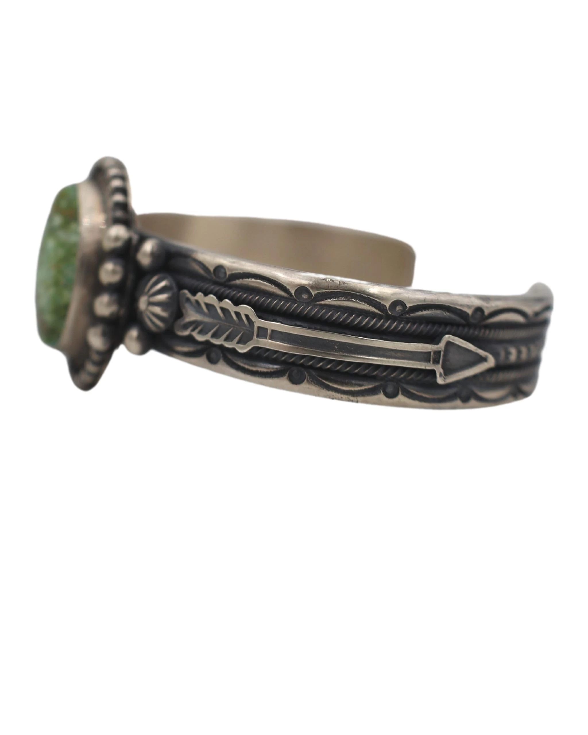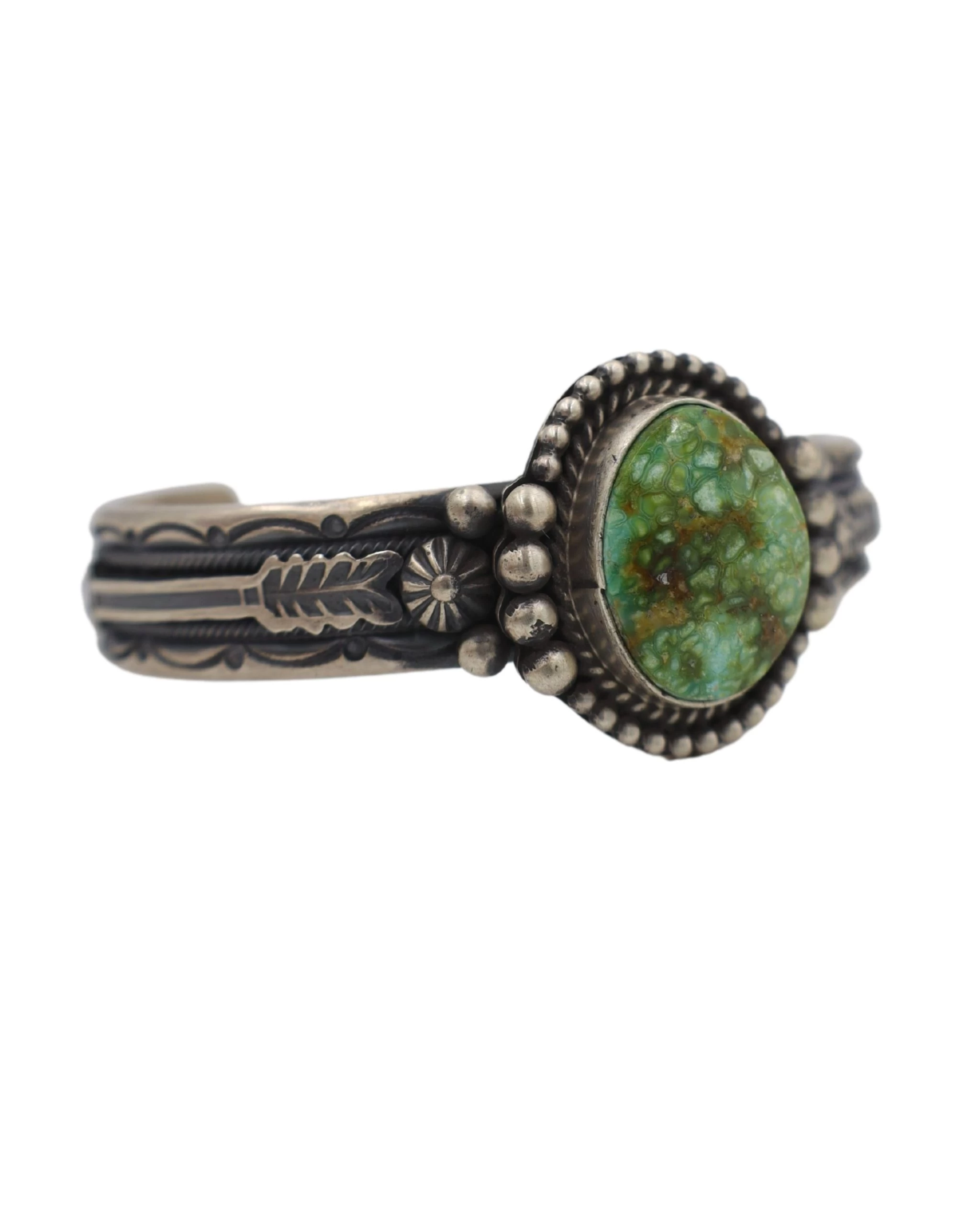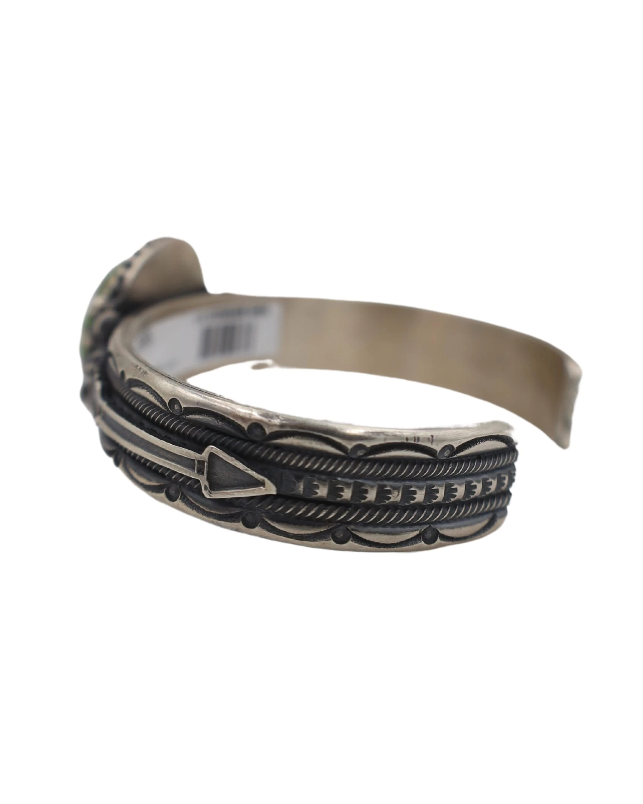 Beautifully crafted with delicate and intricate details, this Green Turquoise Sterling Silver Dots Stamped Band Cuff will be the statement piece of your jewelry collection. With a green turquoise center stone, surrounded by a unique sterling silver roping border, this cuff will turn heads and leave a lasting impression. Ready to make a statement?