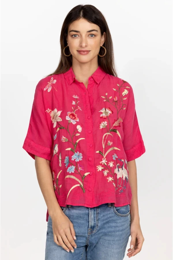 Designed from breathable ramie, the Geniveve Relaxed Dolman Shirt reworks traditional shirting with blossoming florals. Cut in a relaxed fit, this shirt features a collar, three-quarter length sleeves, and a detailed placement embroidery comprising elegant flowers. Pair with relaxed pants for an effortless day-to-night look. Product Details: • 100% Ramie • Placement Embroidery • Thread Covered Buttons • Model Height: 5’11” • Model is wearing a size Small • Measurements for Size Medium: Length- 27″, Bust- 48 1/2″ • Care instructions: Machine wash cold only. Non chlorine bleach when needed. Tumble dry low. Warm iron.