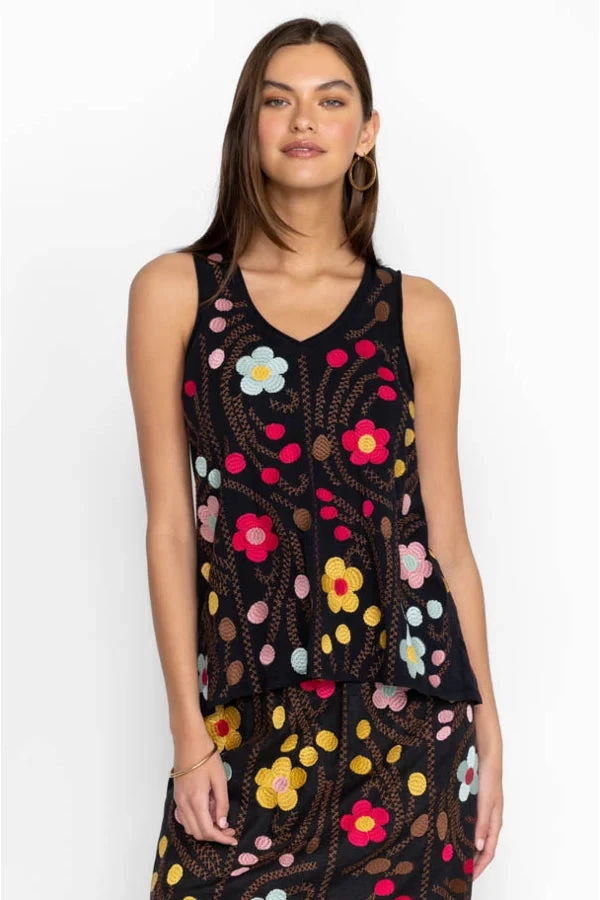 Embrace the changing seasons with the joyful Joni Raw Edge V-Neck Tank. A stylish choice for warmer climates and hazy afternoons, this tank is designed from pure cotton and boasts a V-neck with a raw edge and a light-hearted placement embroidery complete with floral motifs. Style this tank with denim during the day and switch to tailored pants in the evening. Product Details: • 100% Cotton • Placement Embroidery • Raw Edge Neckline • Model Height: 5’11” • Model is wearing a size Small • Measurements for Size Medium: Bust- 39″, Length- 24 1/2″ • Care instructions: Machine wash cold. Non chlorine bleach when needed. Tumble dry low. Warm iron.