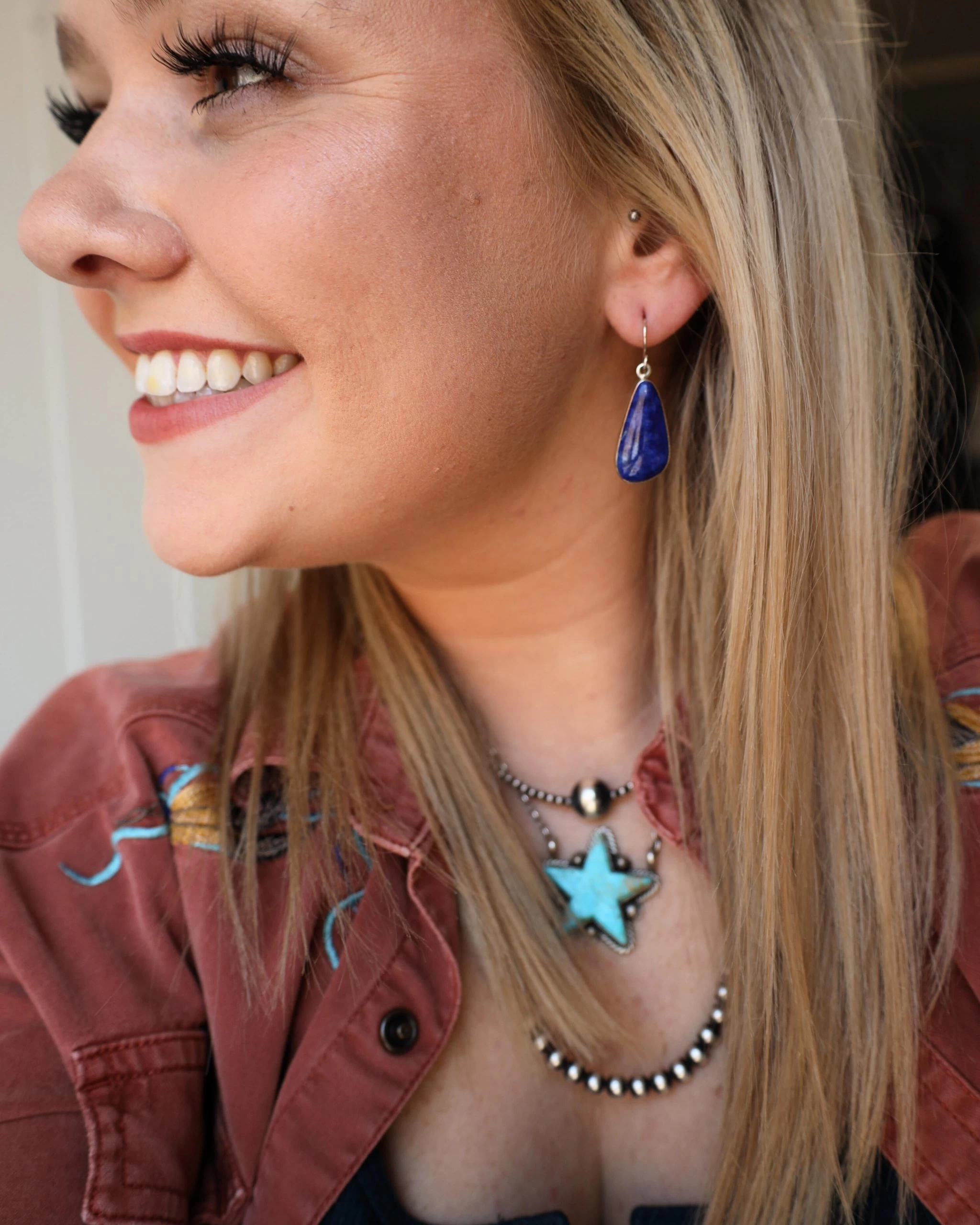 Whether you’re dressing up for a night out on the town or just looking to add some Western flair to your everyday look, these Lapis Triangular Earrings are the perfect choice. Their striking blue color is sure to turn heads wherever you go, making them a must-have addition to any jewelry collection.