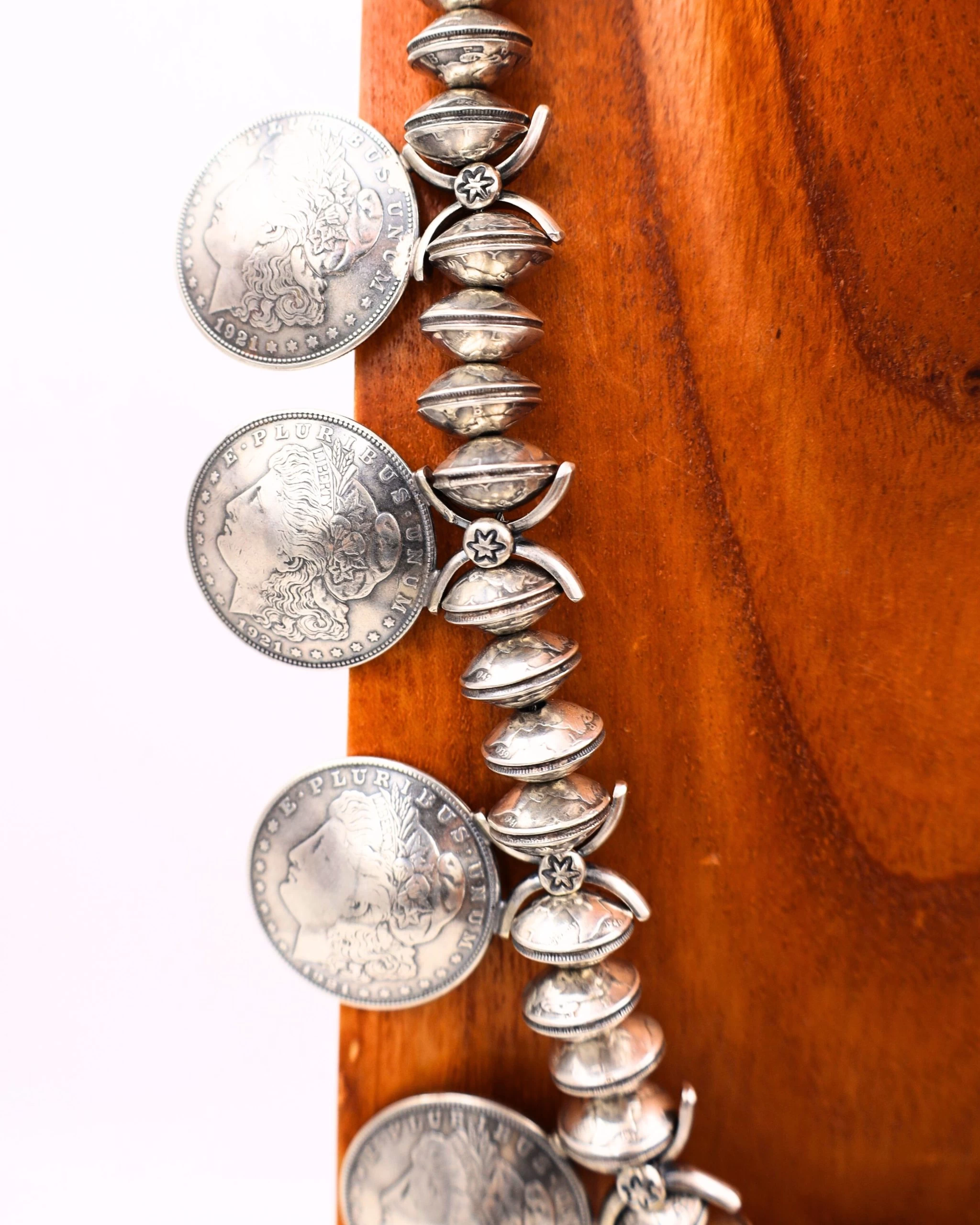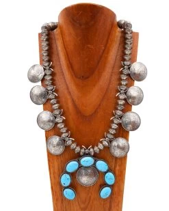 Large Turquoise Naja And Coins Necklace, Polished Sterling Silver. 28″ end to end, hook + eye closure. Stamped “Sterling” and by artist Kenny Ray McNeilley Jr.