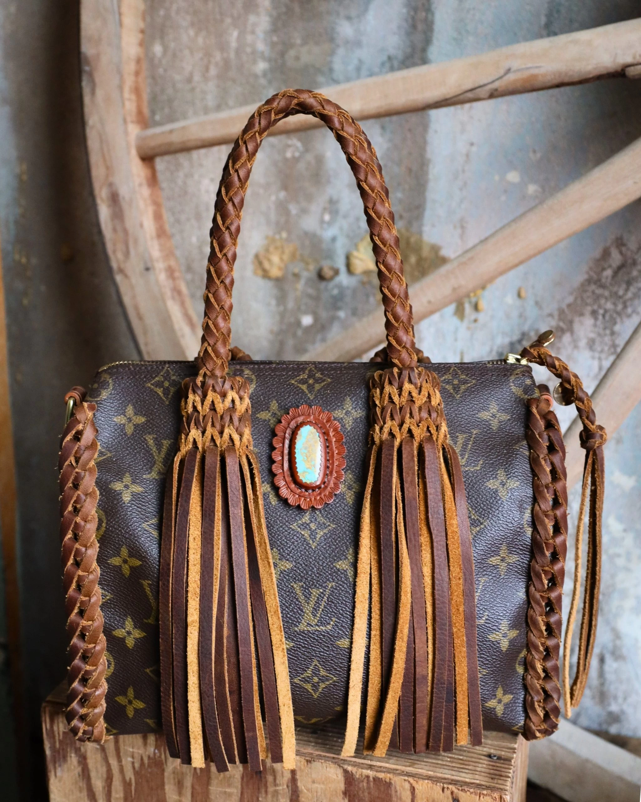 LAV enhanced Speedy 25 in Camel braidwork with a 30 carat Tyron Turquoise stone from JForks Designs. This bag comes with a 40” detachable crossbody strap.