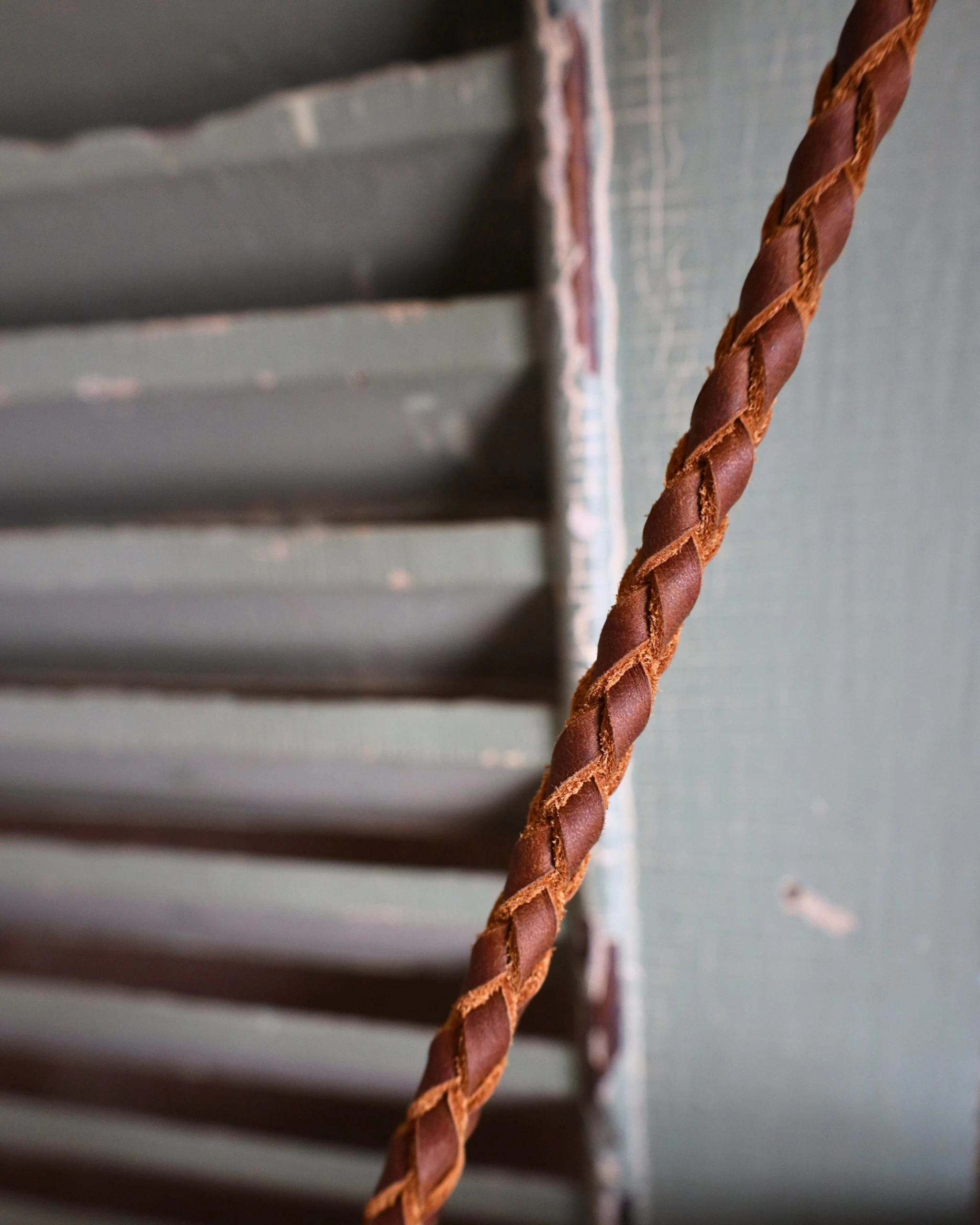 This bag also includes a detachable crossbody strap. The strap is hand braided and measures 48” from snap to snap.