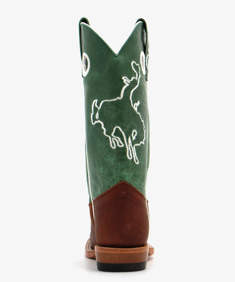 This handsome boot will make your little cowboy jump with joy. This style from Olathe Boot Co. are constructed from brown leather on the vamp, and green “Crazy Cat” leather on the shaft with a white bucking bronco stitch design. Other details include a square toe (WS), double welt stitch, pull tabs and holes, leather lining, leather insole, and 1″ cowboy heel. Shaft length will vary with shoe size.