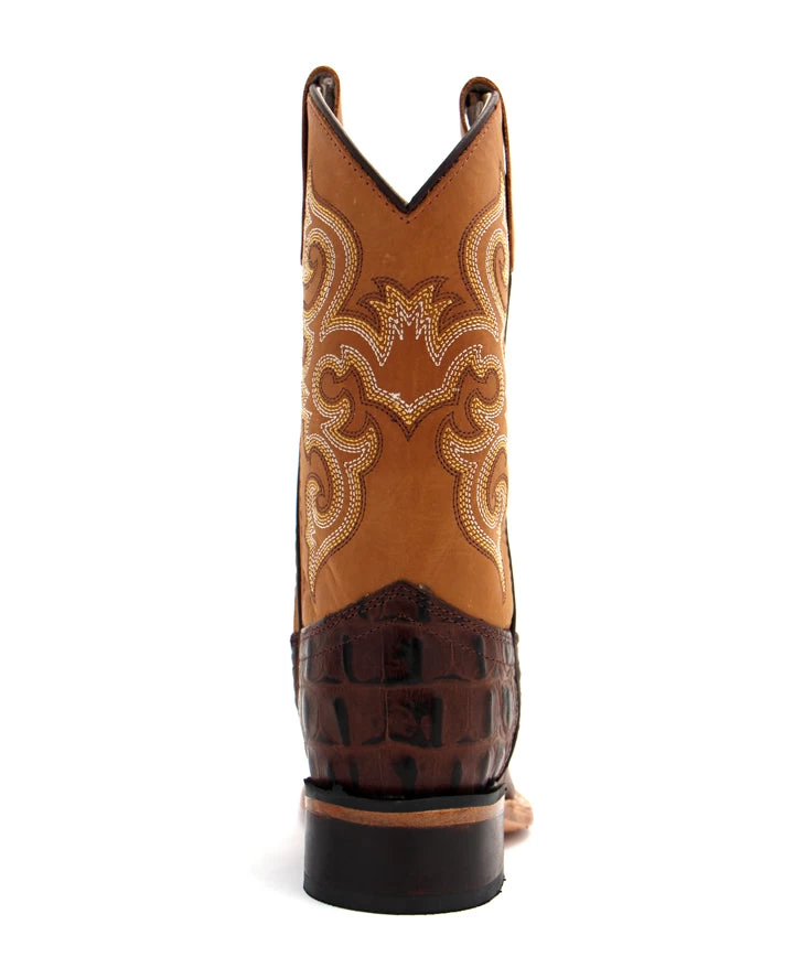 Your little pardner will blaze a trail in these gator print boots. The vamp is constructed from a brown leather with a caiman style print, and the shaft features a tan leather with a 6-stitch design. Details include a 8-3/4″ shaft, pull tabs, square toe and 1-1/4″ heel. A great boot for a western formal occasion.