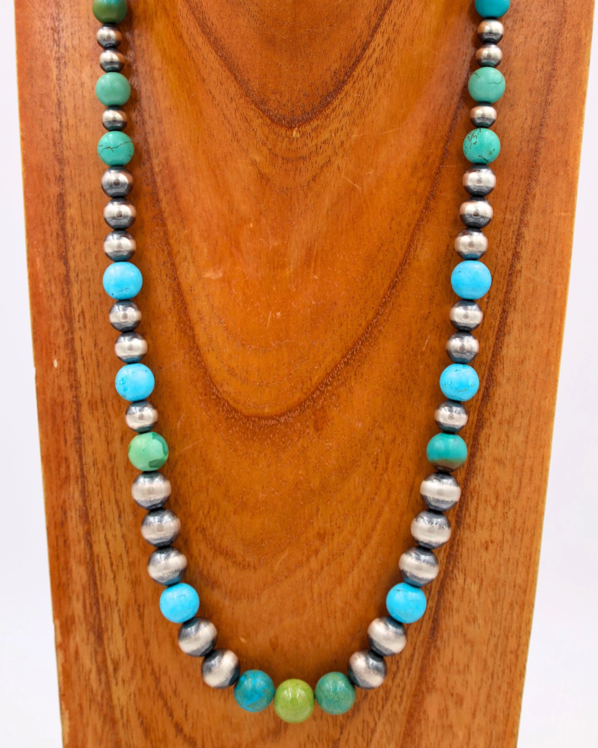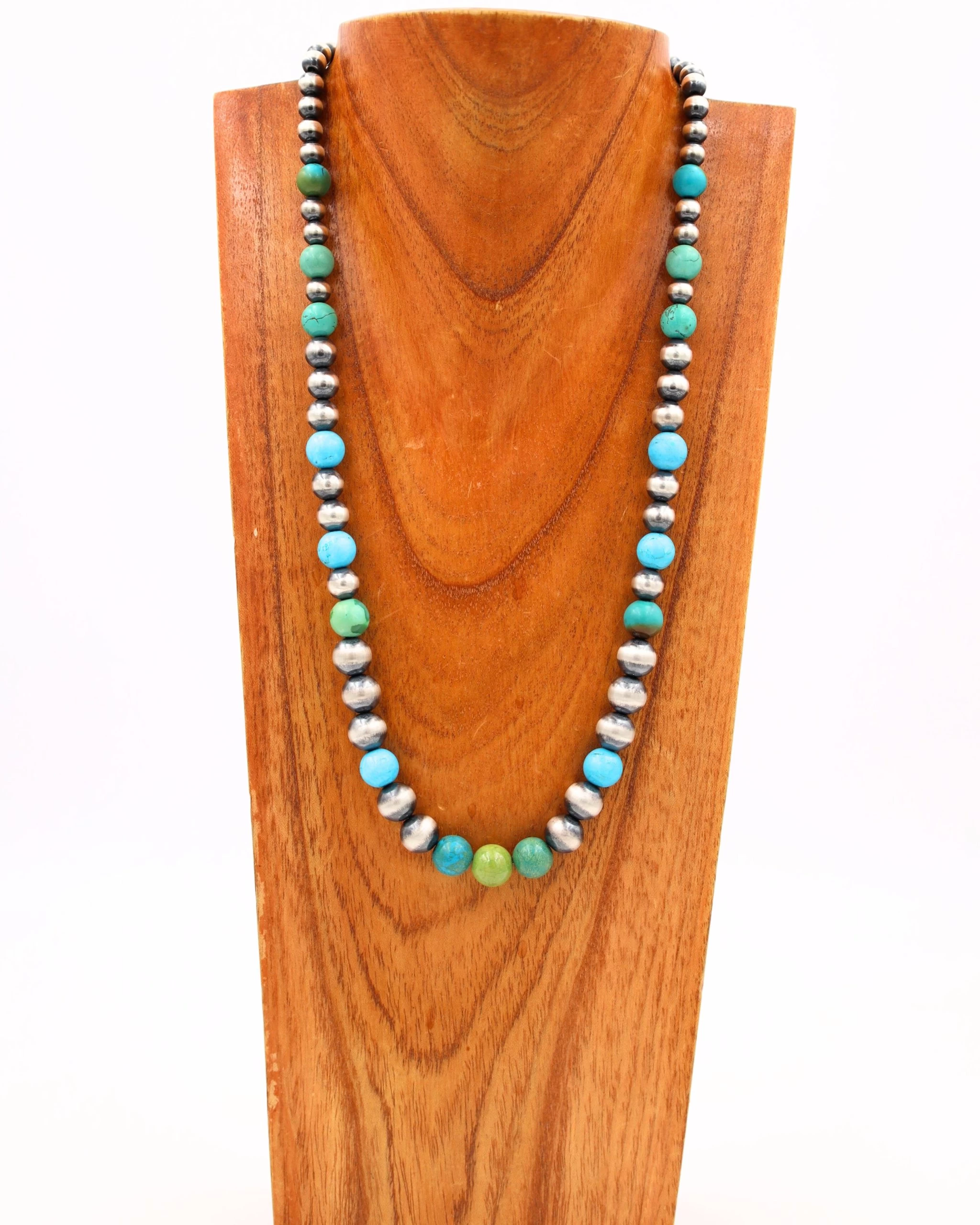 Make a statement with this enchanting Navajo pearl necklace with shining green and blue turquoise balls. Perfect for everyday wear, layer it with other necklaces for maximum impact! Add a touch of style and sophistication with this captivating piece!