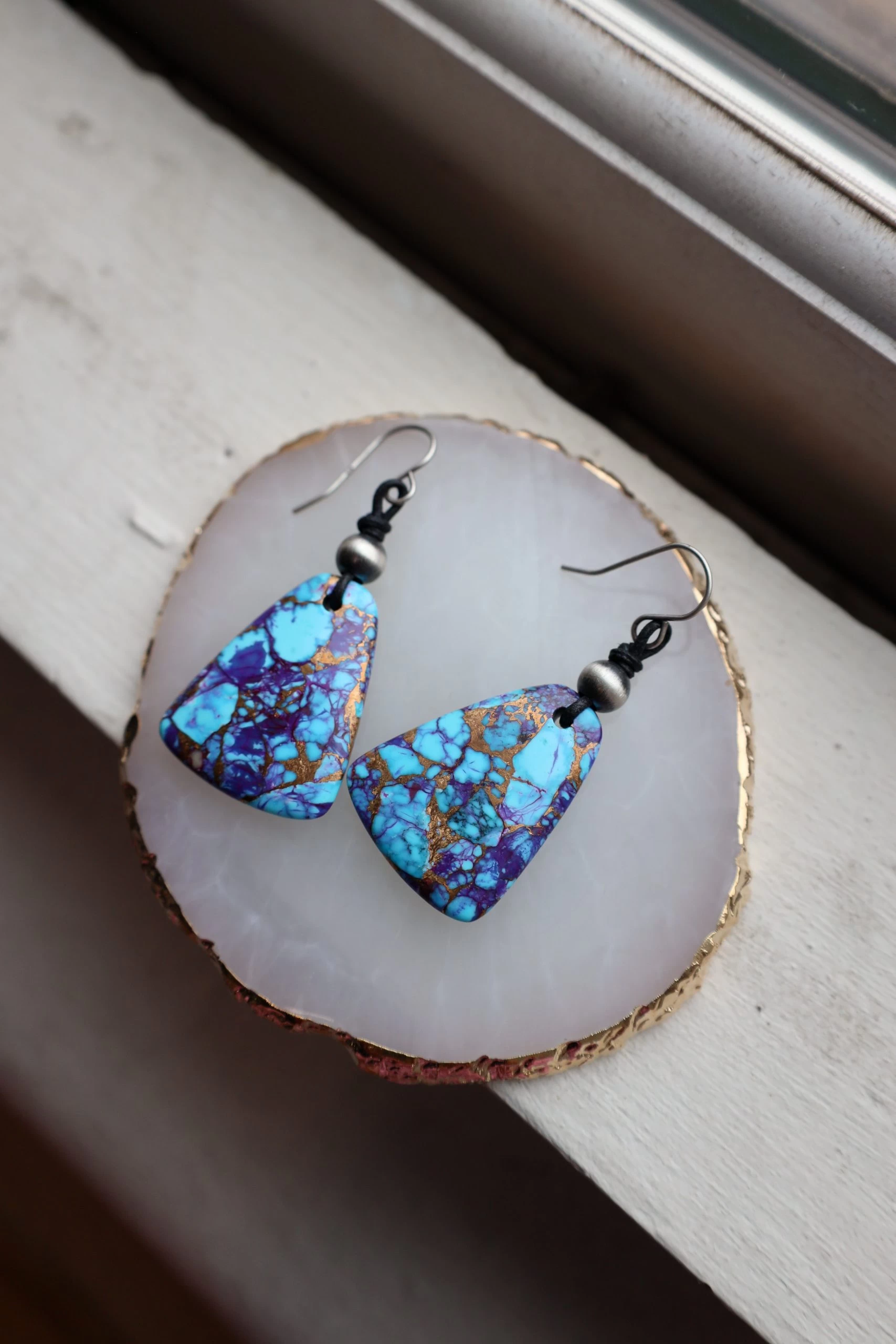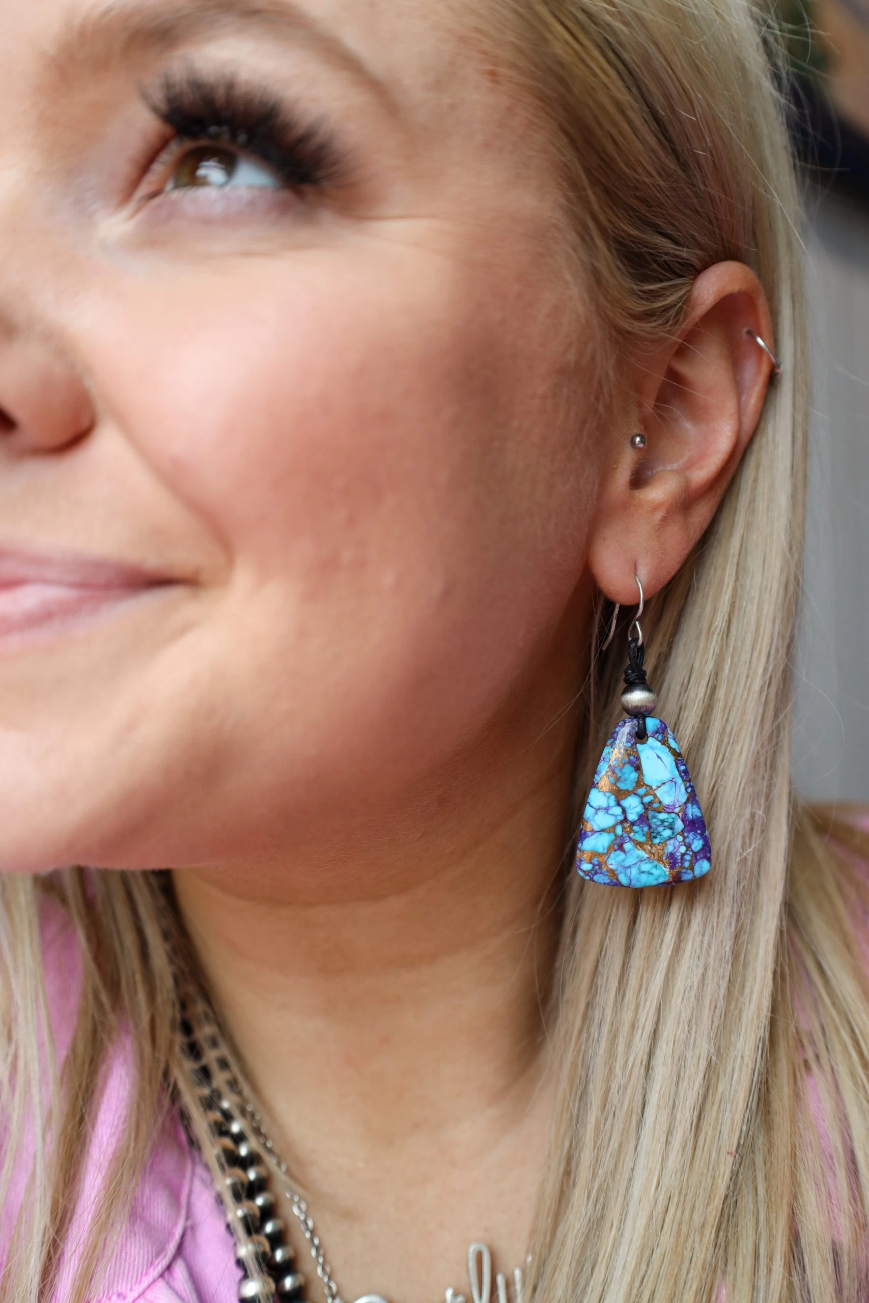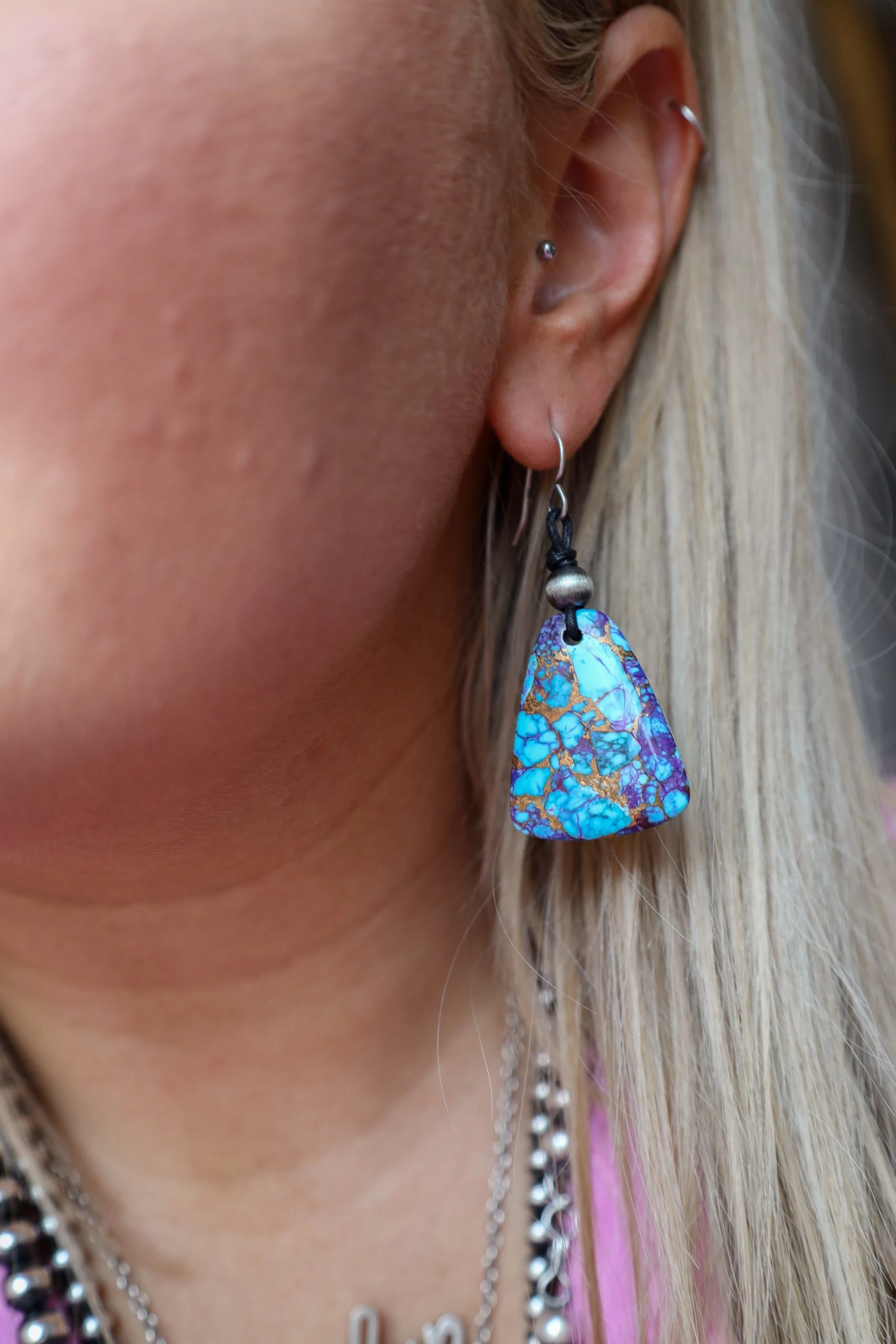 Make a statement with this unique, Peyote Bird Purple Mojave Earring. Featuring an unusual stone, this one-of-a-kind piece adds an eye-catching cool tone to your look. With a larger size and statement design, you’ll be turning heads everywhere you go! So why wait? Get yours today and stand out from the crowd!