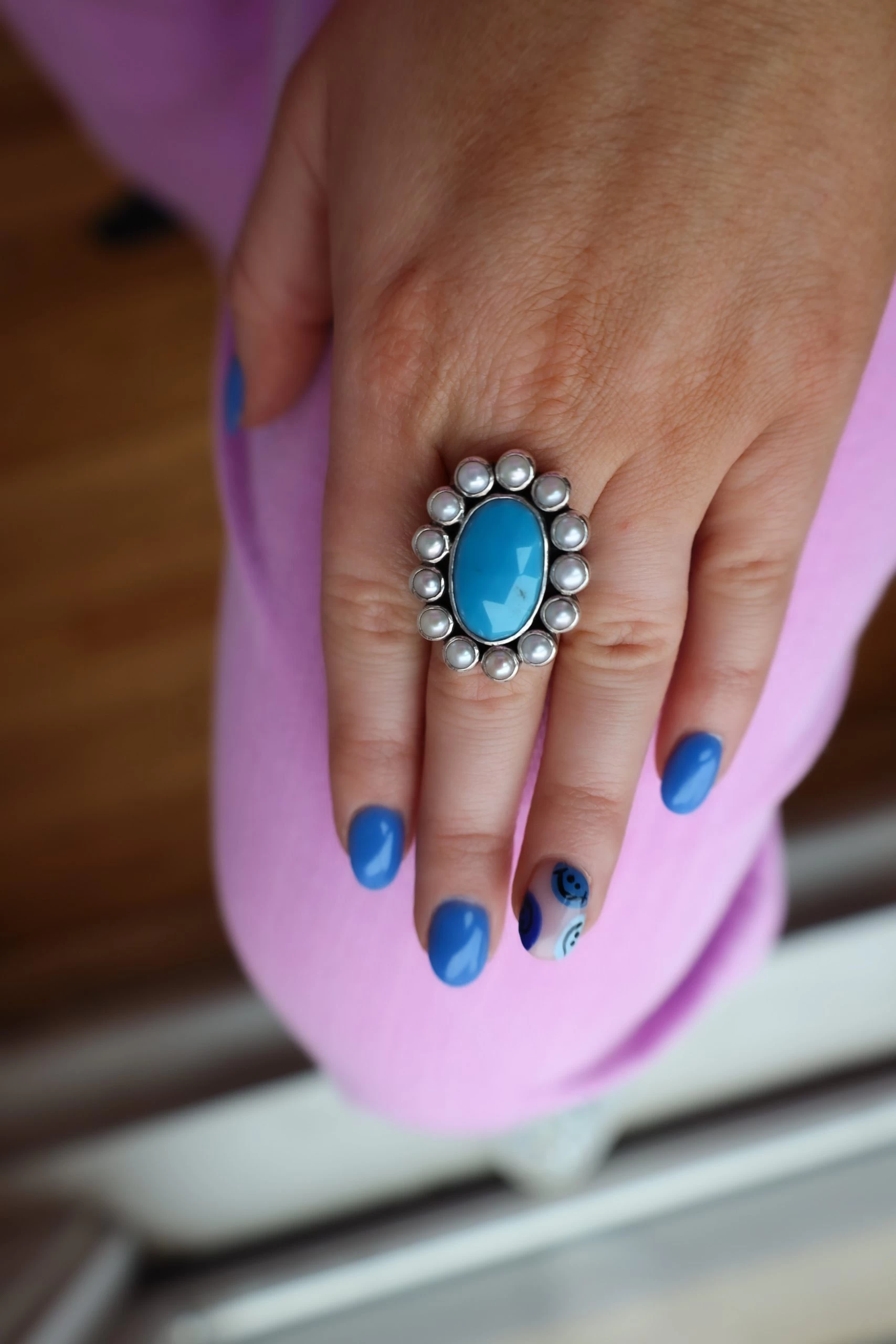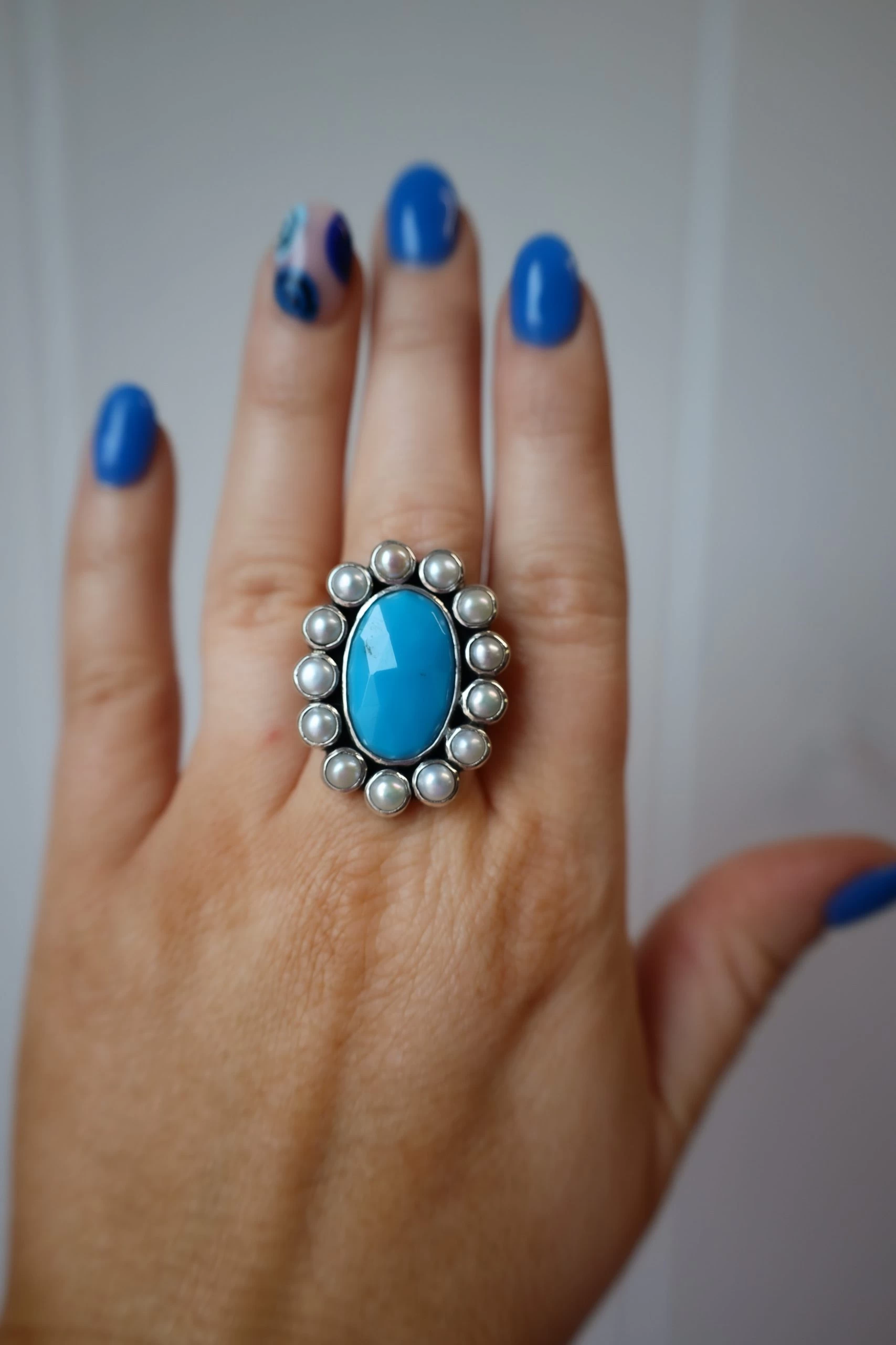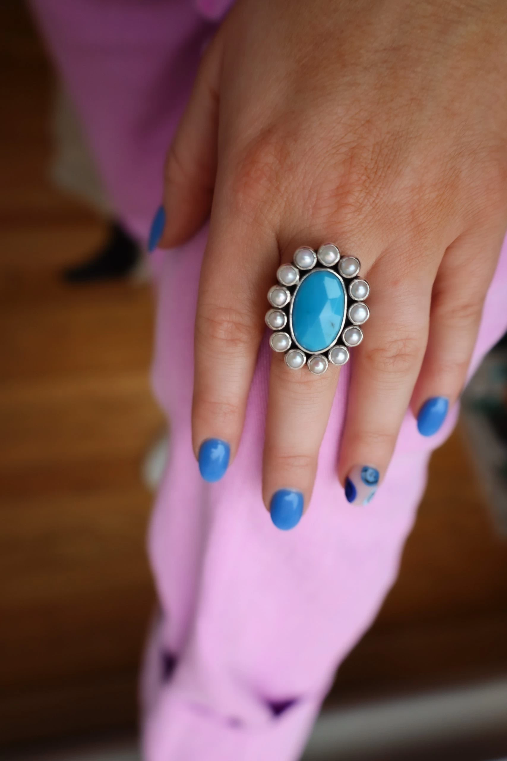 This Peyote Bird Sleeping Beauty Faceted With Pearls Surrounding Ring showcases a stunning combination of ethically sourced materials. It features a beautiful sleeping beauty turquoise stone, surrounded with pearls and unified in a delicate bezel setting. The ring is crafted with precision, resulting in a timeless piece that will make a special addition to any wardrobe.