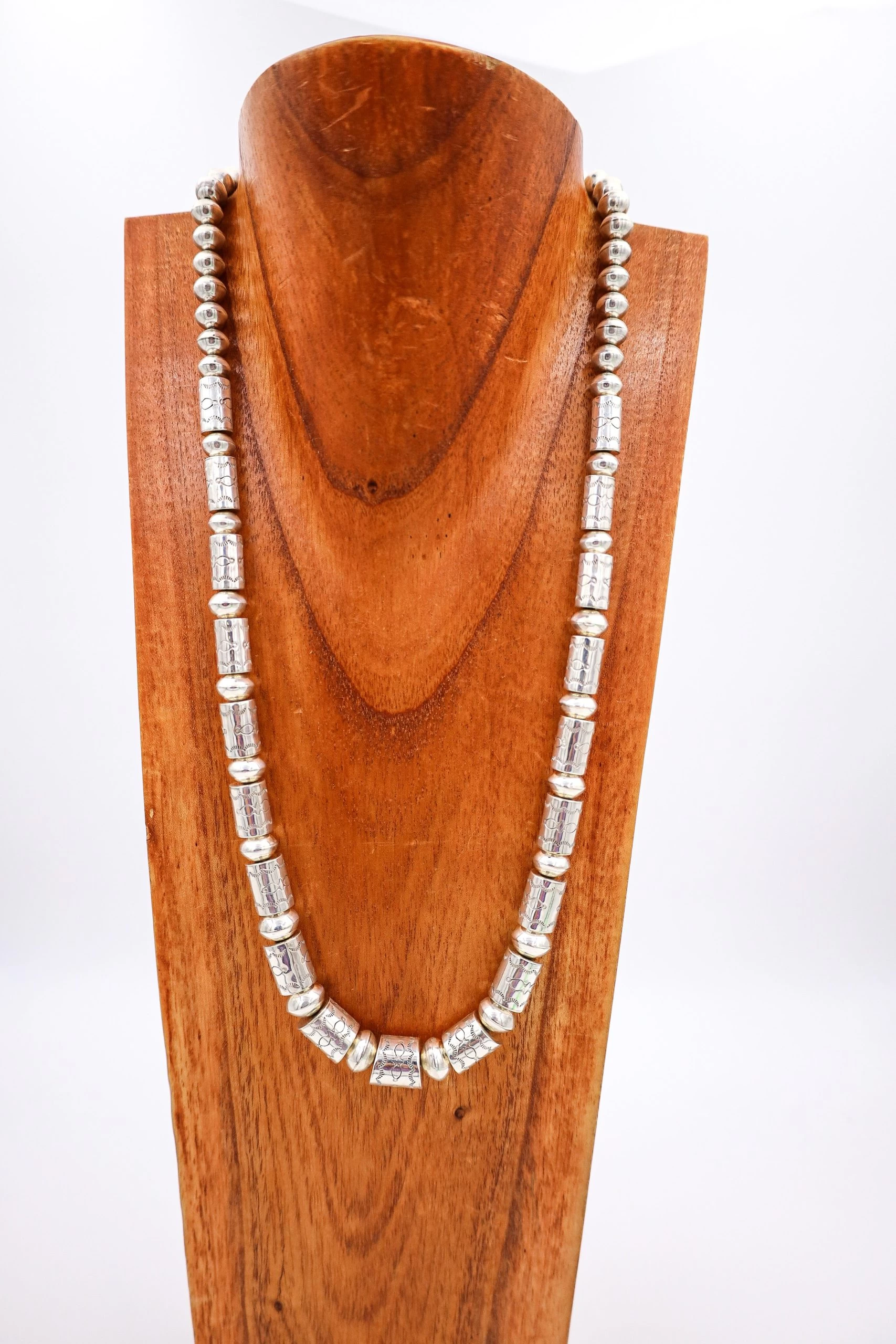 This beautiful and chic Peyote Bird Sterling Silver Stamped Tubes Saucers Necklace is the perfect way to add an elegant touch of style to any outfit. Handcrafted from high-end sterling silver, the unique south western design on each bead adds a unique and inspiring flair. Show off your originality and sophistication with this eye-catching necklace!