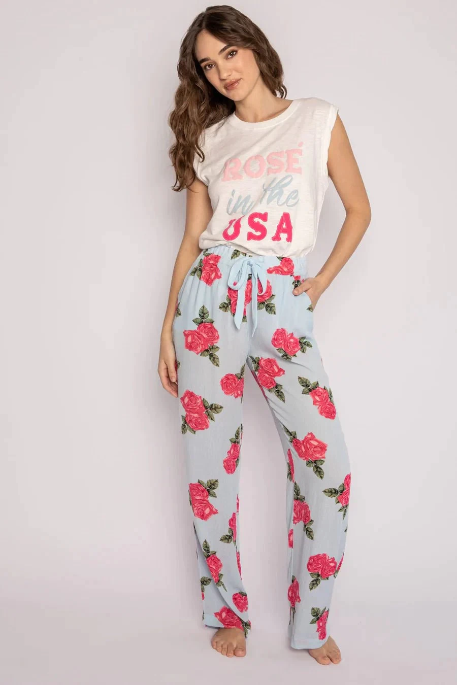 The ivory tank has lettering on the front, Rose In The USA in pinks and blues. Soft, breathable cotton-model jersey fabric. Â