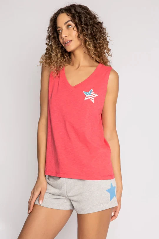 DESCRIPTION:Â When love calls – you’ve got the graphic tee. We love this sleeveless. relaxed fit cotton-blend tank with a heart & LOVE graphic on back. Model is 5′ 9″, wearing size small.