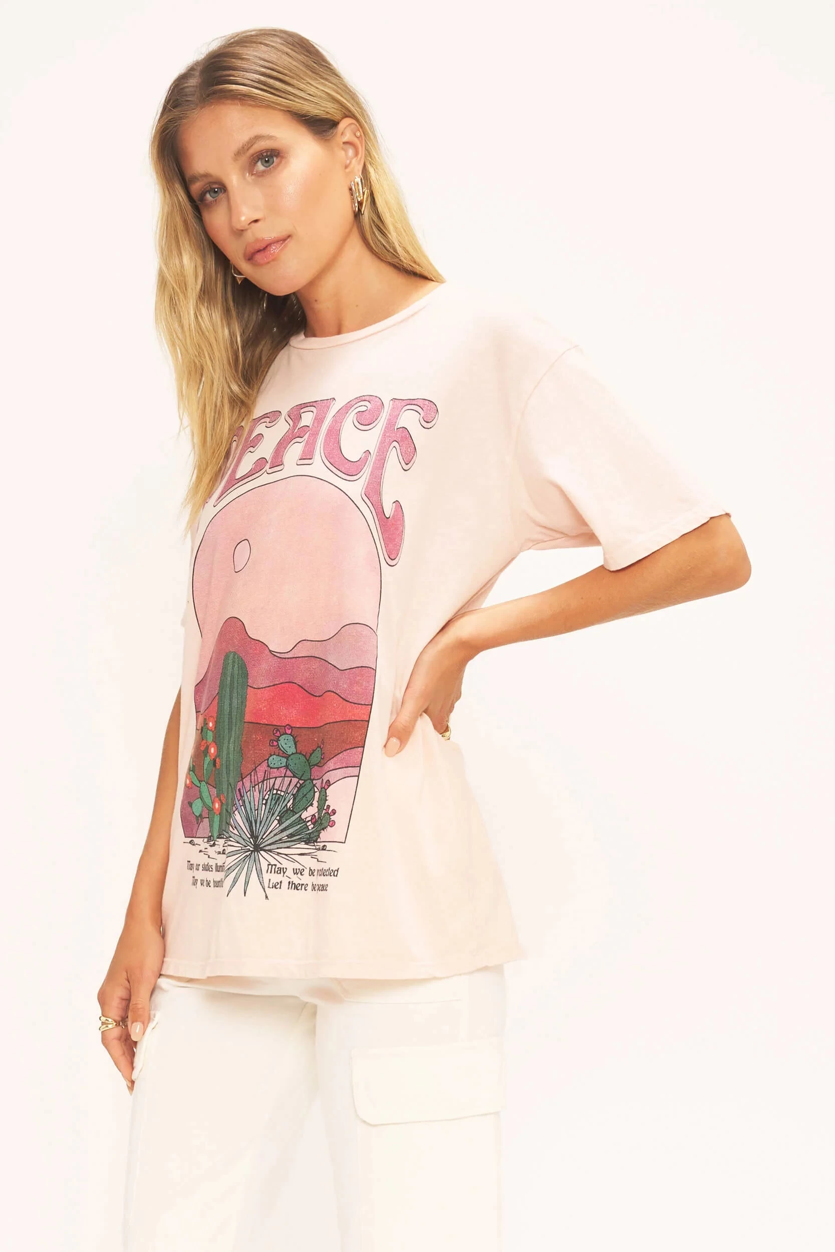 Our Desert Peace Easy Fit Tee features a desert-inspired graphic on top of our cameo rose colorway that has quickly become a fan favorite. Made of a soft 100% cotton fabric, this tee has a comfortable, relaxed fit with drop shoulders and a crew neckline. Pair with white pants and a simple heel for a cheerful spring look.