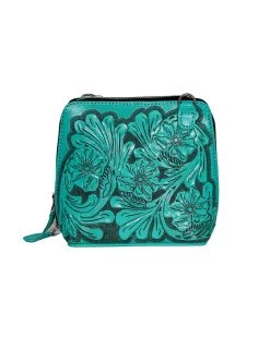 Made in Mexico, these handbags are the finest leather and tooling! Workmanship and details a joy to behold! Square with attractive tapered shape of 8.5 x 7 x 3″ bag with cute 48″ cross body strap. One side has tooled basket weave texture and the other has traditional floral motif, with zip closure. Inside secure zipped pocket.