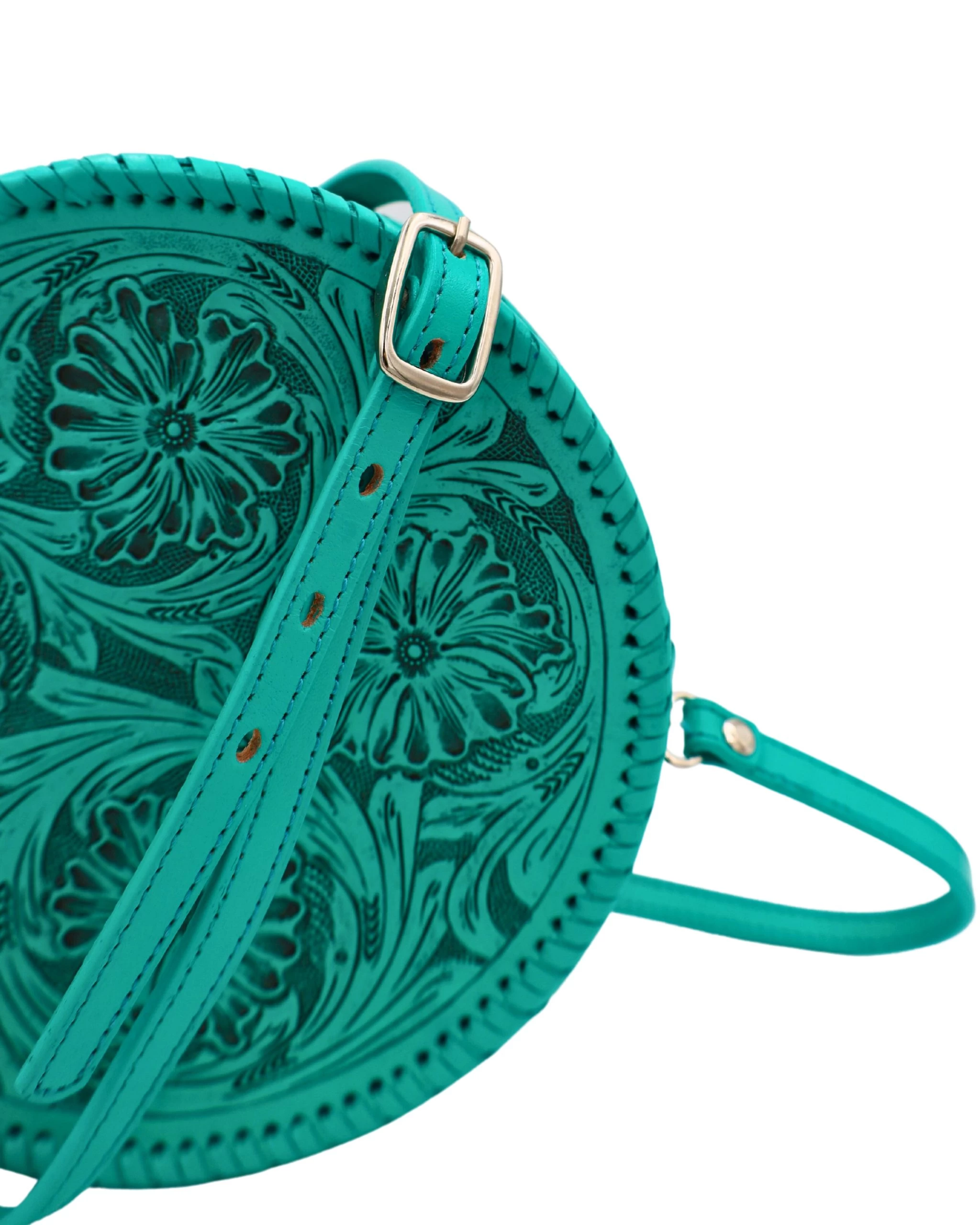 Crafted from high-quality turquoise leather, this purse is both durable and stylish. The tooled floral leather on either side adds a touch of elegance and Western flair to the piece. The round shape of the purse is not only fashionable but also functional, providing ample space for your essentials while maintaining a sleek and stylish appearance. The bags circumference is 8.5 inches.