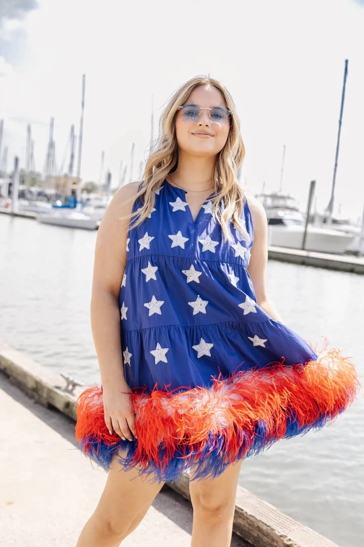 This Queen of Sparkles – Blue Star Feather Bottom Tank Dress dazzles in sparkly white stars. Perfect for celebrating the 4th of July, this dress will ensure that you look and feel like a Queen! Crafted from lightweight material for a comfortable fit, you’re sure to turn heads and make a statement.