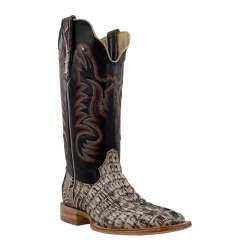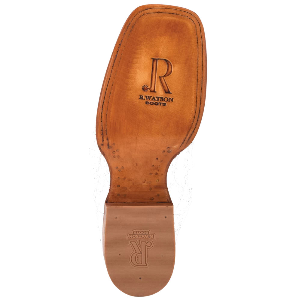 R. Watson presents these orix hornback caiman tail and chocolate malagra cowhide exotic western boots. These boots have a 10 row stitch pattern, R. Watson comfort system, all leather stacked heel, counters, solid steel shank, and 10 iron outsole. 13″ total in height.