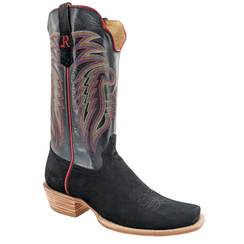 R. Watson presents these black rough out and black sinatra cowhide western boots. These boots have a 10 row stitch pattern, R. Watson comfort system, all leather stacked heel, counters, solid steel shank, and 10 iron outsole. 13″ total in height.