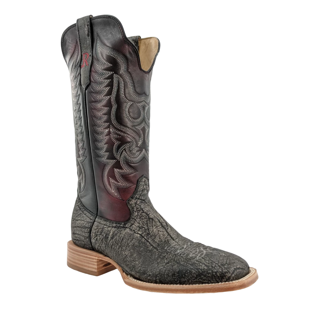 R. Watson presents these smoke grey cape buffalo and black cherry brush off cowhide western boots. These boots have a 10 row or corded stitch pattern, R. Watson comfort system, all leather stacked heel, counters, solid steel shank, and 10 iron outsole. 13″ total in height.
