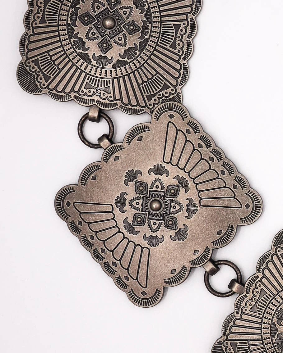 Angel Ranch Ladies belt by M&F Western Products. Chain style belt with a floral engraved design on 3” square conchos. Silver. Conchos Measure: 3”. Floral Design.