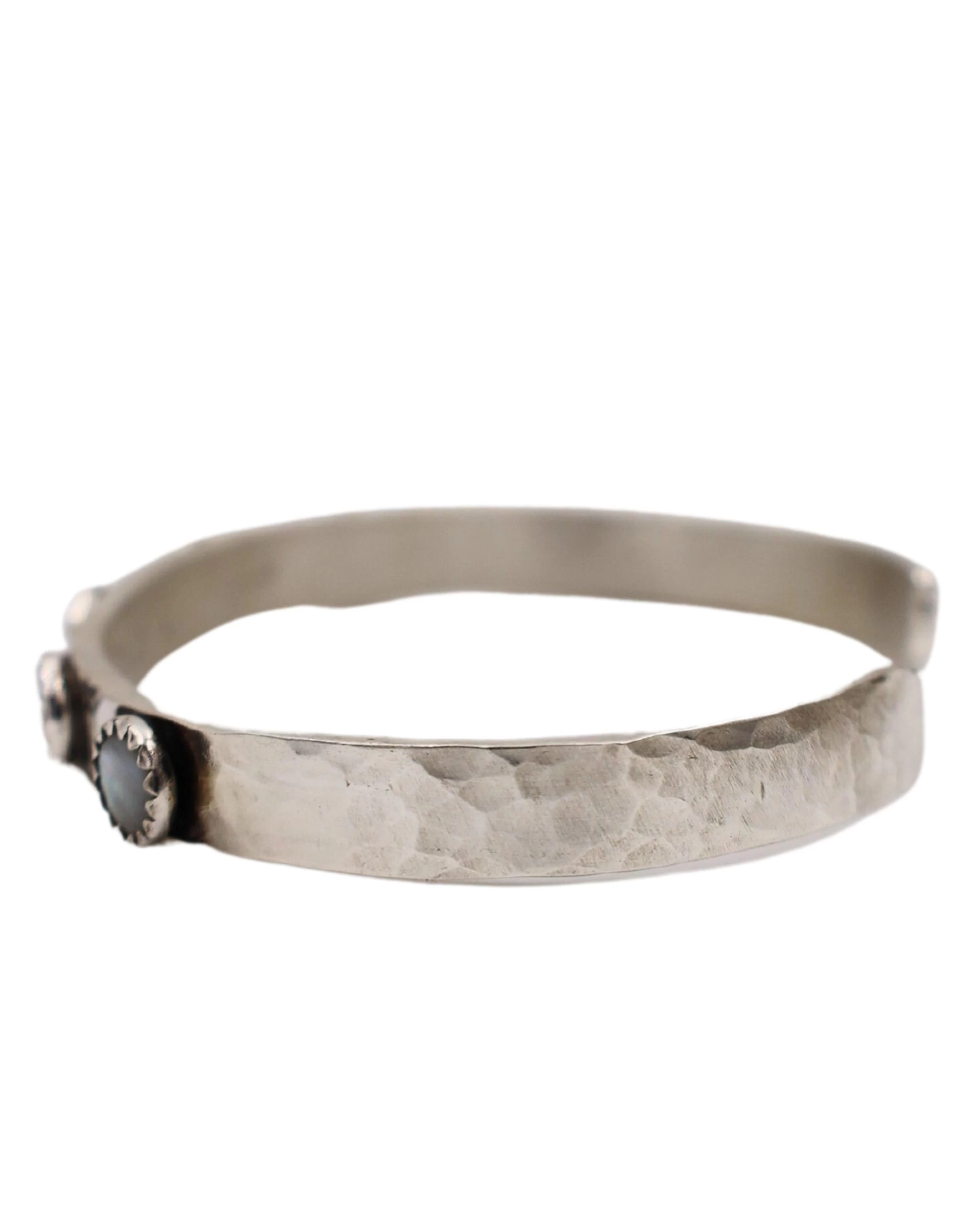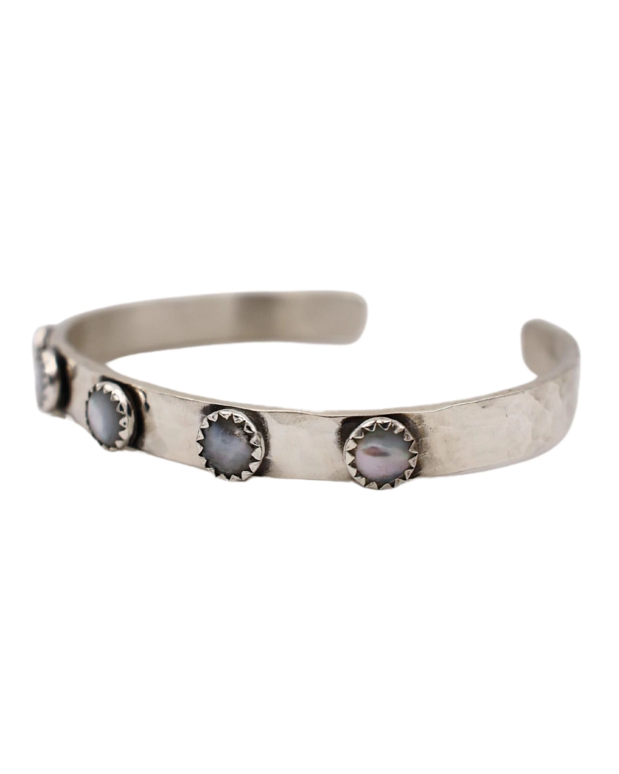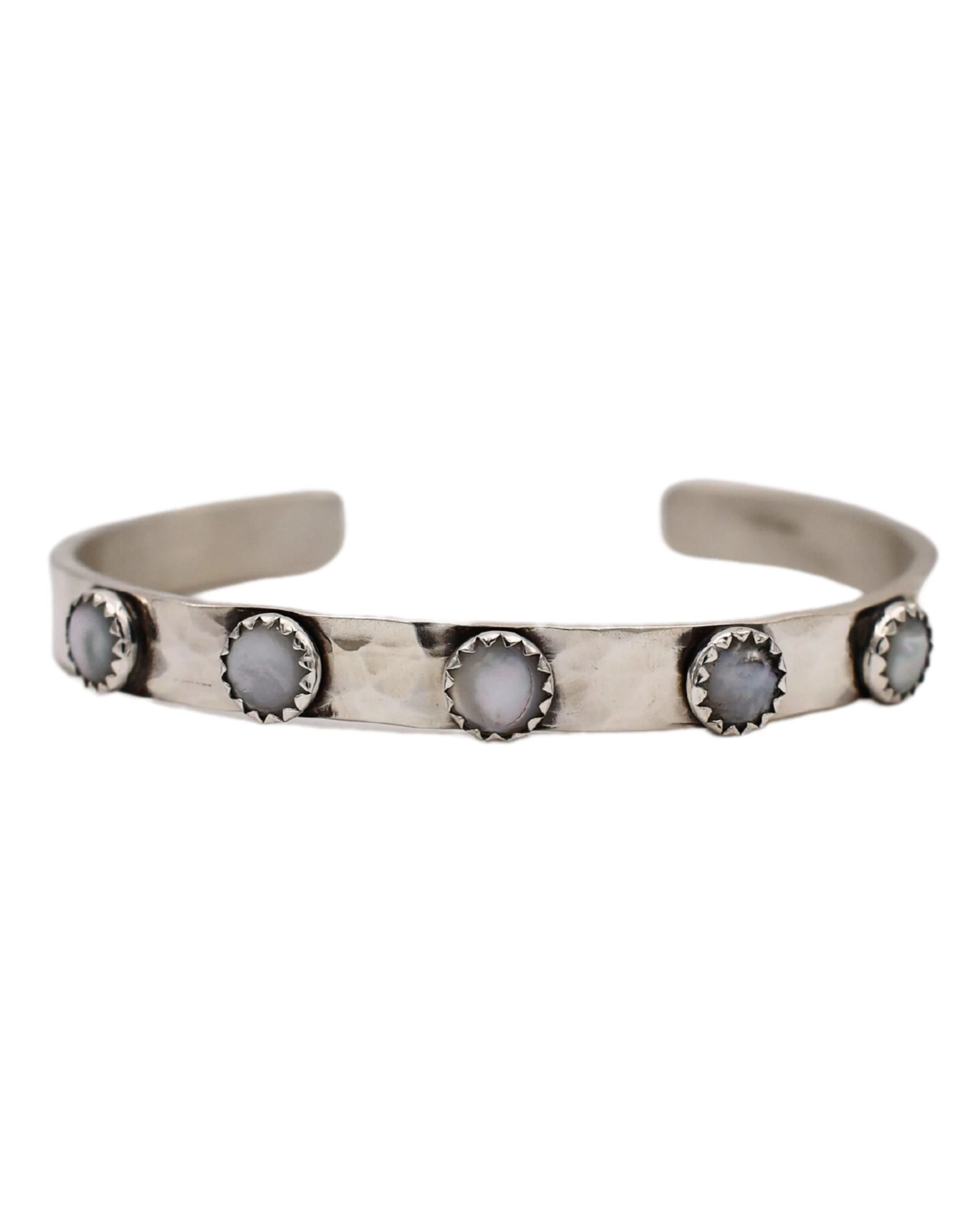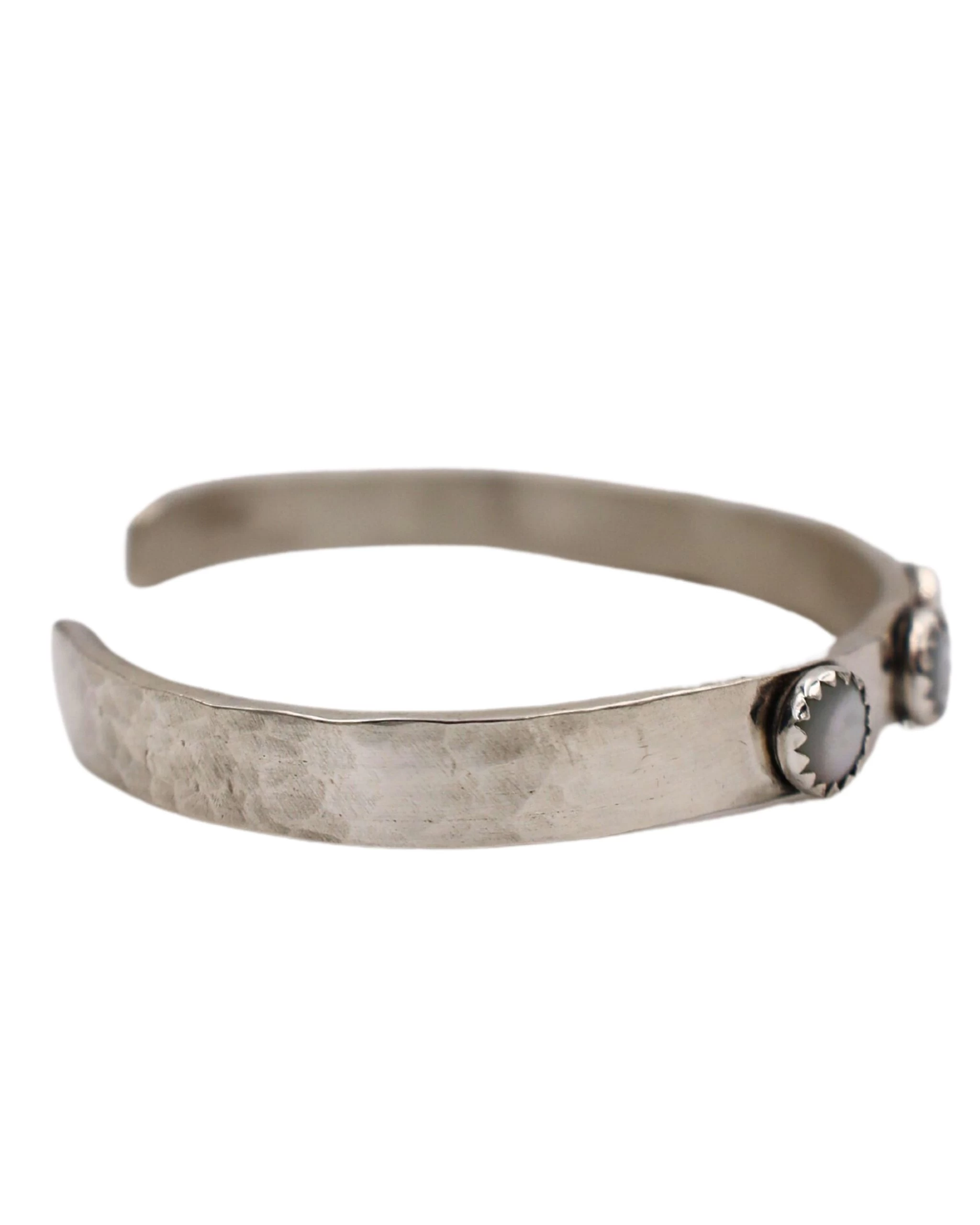This gorgeous cuff hand made by Texas native Richard Schmidt highlights the beauty of the Mother of Pearl stone. Hammered Sterling Silver cuff adorned with Mother of Pearl stones throughout. Worn on its own or stacked with your favorite bracelets.