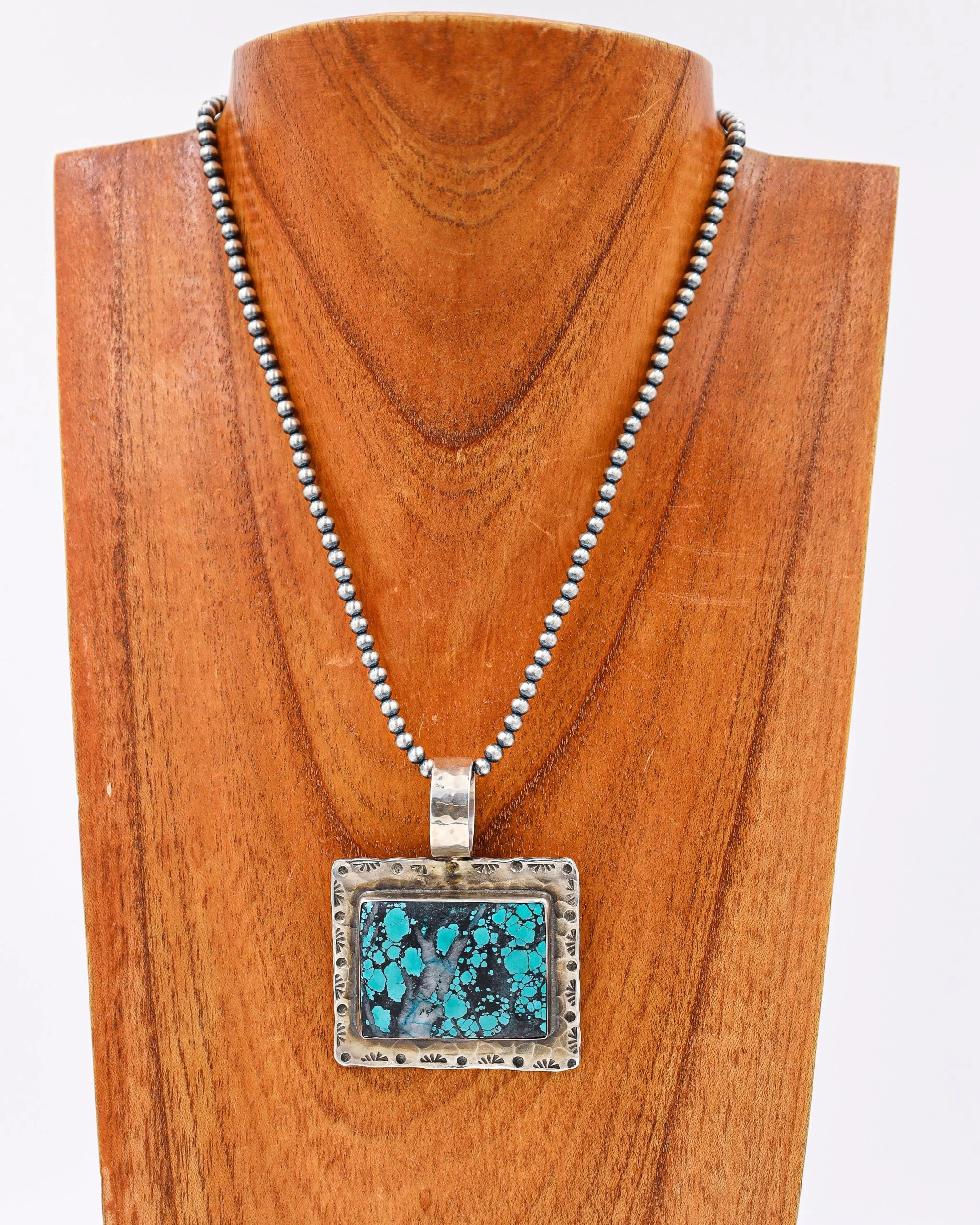 This eye-catching pendant handmade by Texas native Richard Schmidt highlights the beauty of the Turquoise stone. A gorgeous rectangular-shaped dark Turquoise stone is plated on Sterling Silver with a subtle engraved border. This truly spectacular pendant is sure to make any necklace a statement!