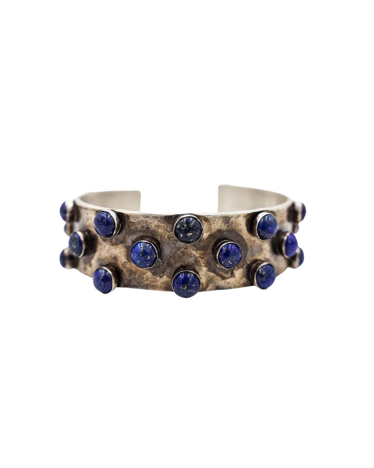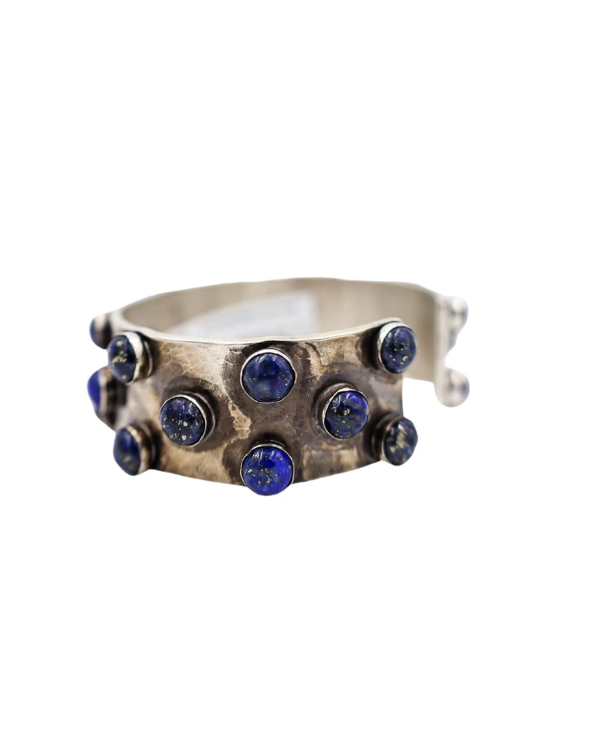 This gorgeous cuff hand made by Texas native Richard Schmidt highlights the beauty of the Lapis stone. Hammered Sterling Silver cuff adorned with Lapis stones throughout. Worn on its own or stacked with your favorite bracelets, the Scattered Lapis Cuff can tie together any outfit!