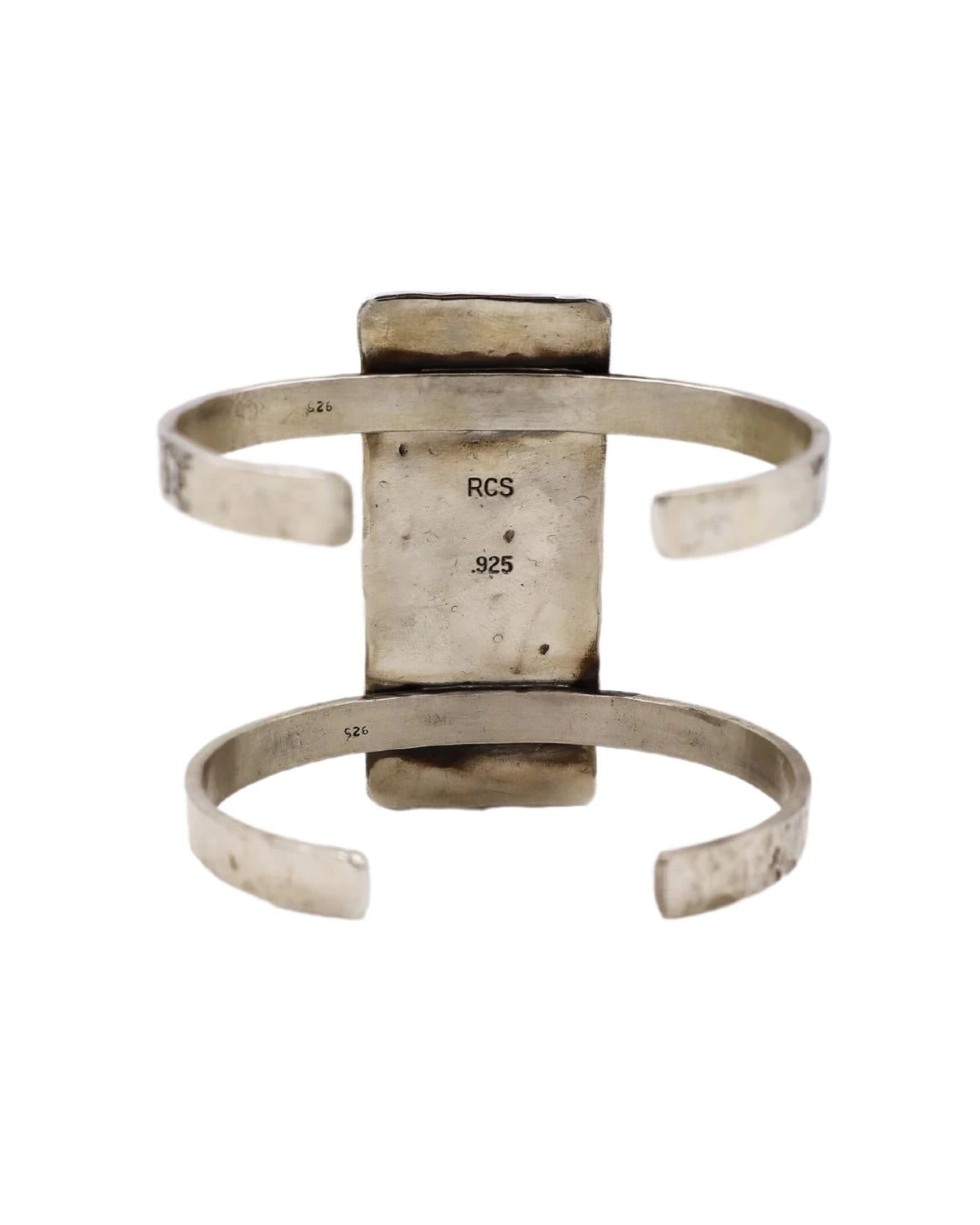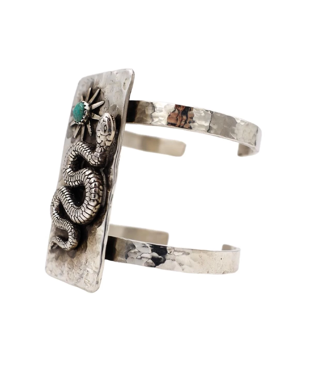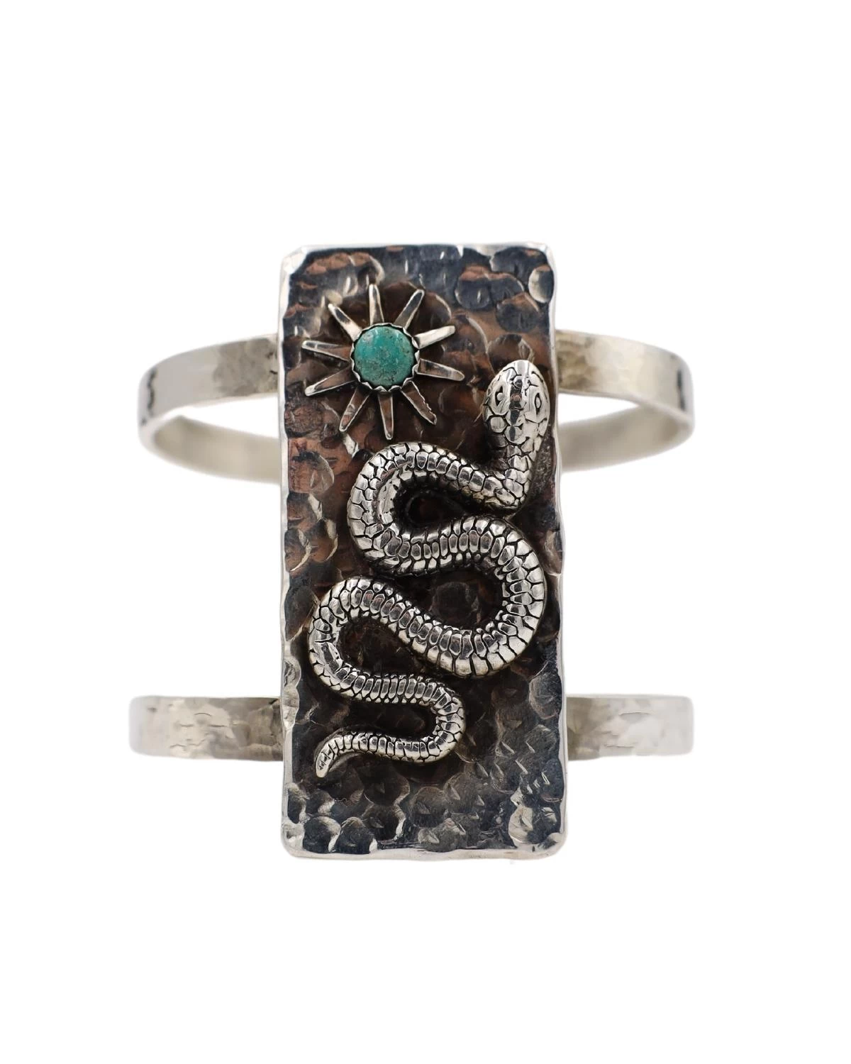 Though simple in its design, this stunning cuff handmade by native Texan Richard Schmidt highlights intricate craftsmanship in the detailing of the snake scales. Accented with one medium Turquoise drop, the overall design is balanced in an elegant way with hammered Sterling Silver dual cuff bars. Wear this beautiful piece for an eye-catching look!